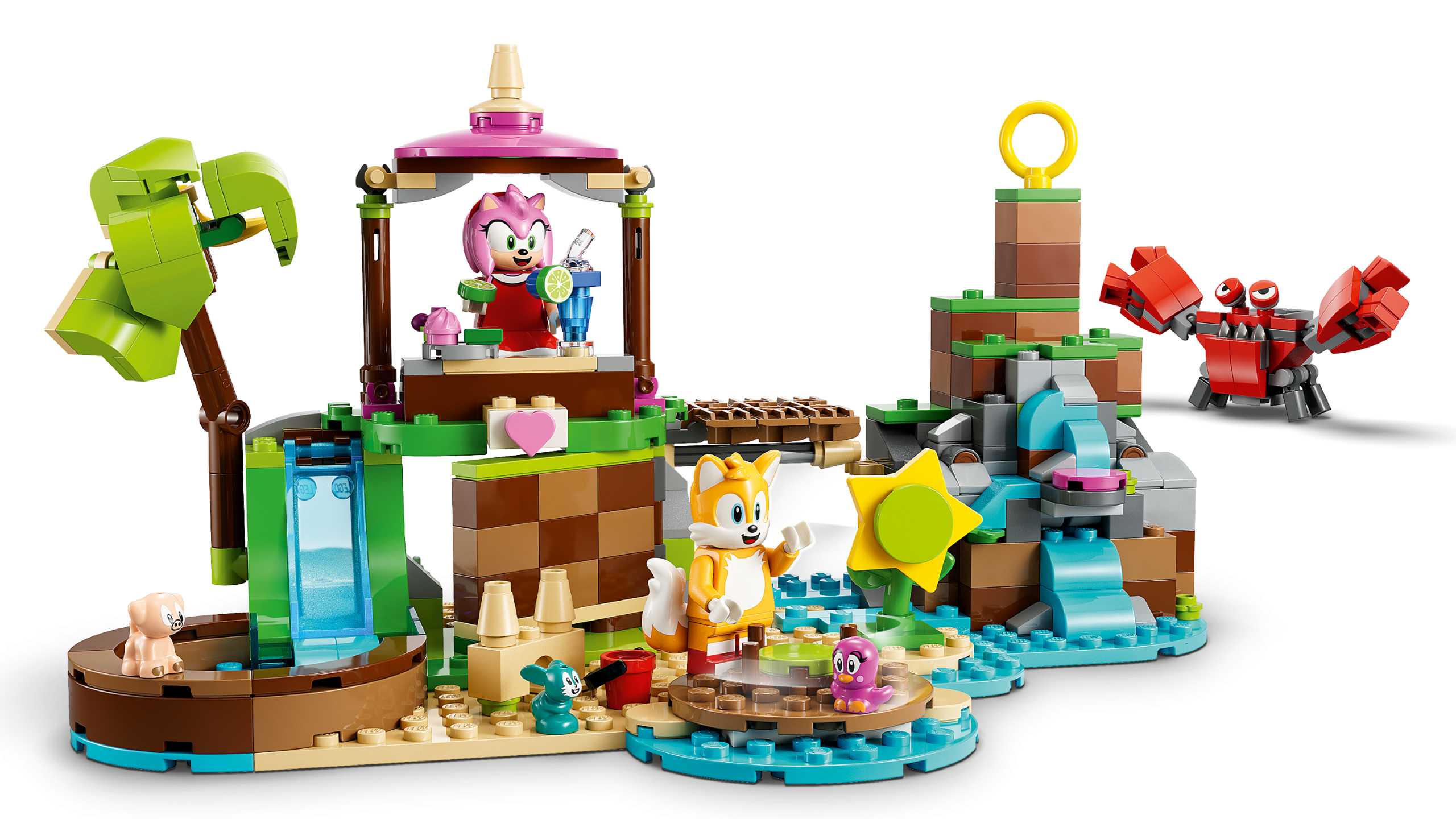Kids can use the drawbridge and waterfall trap to defeat the Badnik who’s trying to steal the animals. There’s also a secret doorway that leads to the kitchen and sleeping areas where kids can care for the animals that have been saved.