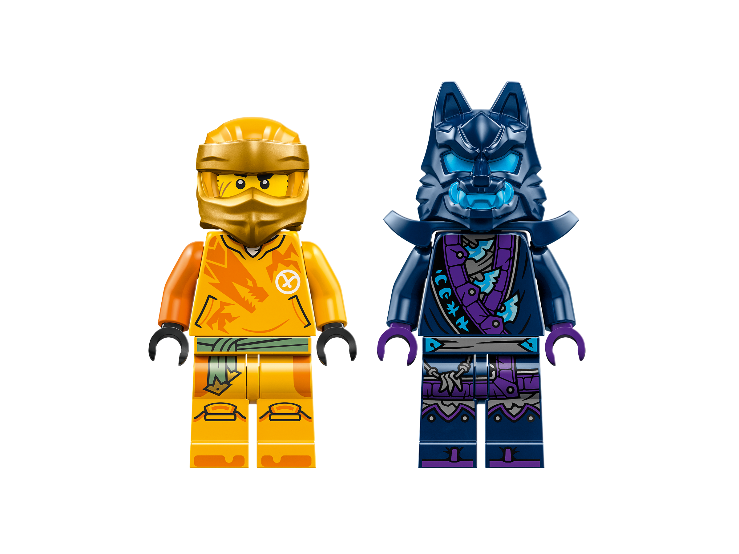 This LEGO® set comes with 2 minifigures: Arin with a katana accessory and a Wolf Mask Warrior with a sword accessory. Arin fits in the posable mech figure, which wields a large sword and rotating blade, while the Wolf Mask Warrior can fly in a glider that has posable wings, a disc shooter and 2 spears. There’s also a brick-built crystal cave with a magic mallet inside and a weapons rack with 2 golden katana sword accessories.