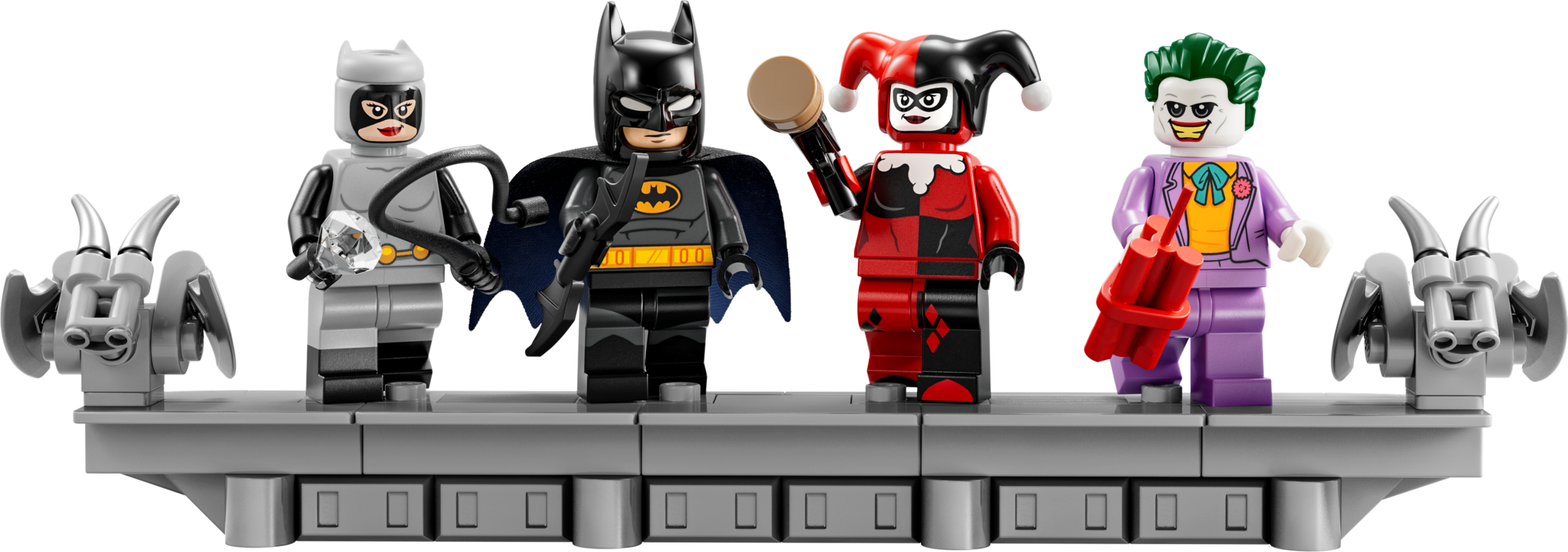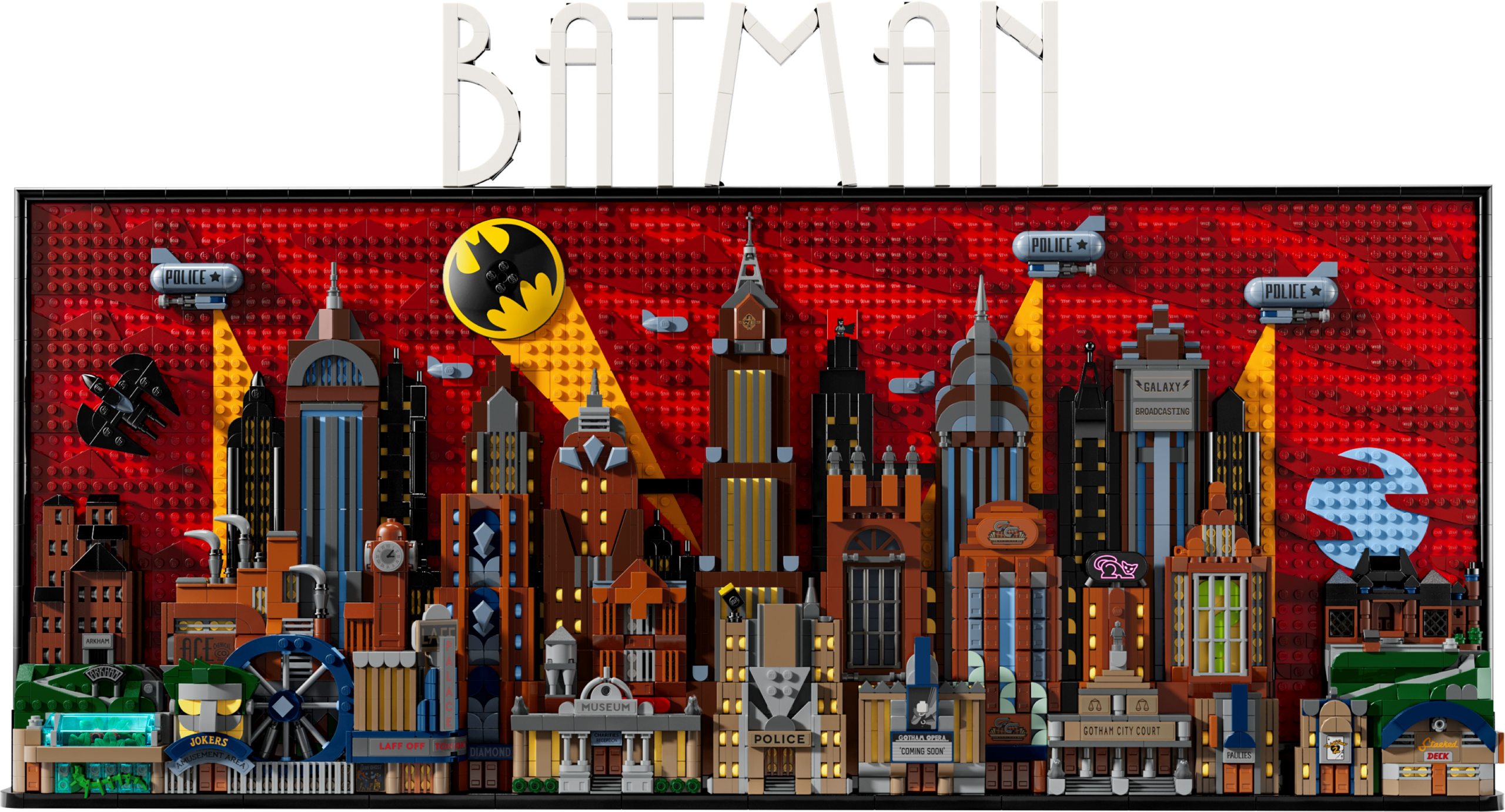 This 4,210-piece buildable GOTHAM CITY backdrop measures over 76 cm (30 in.) wide. It incorporates 15 panels that remove to reveal the inside of Wayne Manor, the Batcave™ and Arkham Asylum, and the activities of numerous villains from Batman: The Animated Series. The set also includes 4 minifigures – Batman, The Joker™, Harley Quinn™ and Catwoman™ – and a removable Batmobile™ and Batwing™. The assembled model can be mounted on a wall or stood on a surface using a flip-out stand. The 2 sets of included building instructions allow 2 people to work on the model simultaneously. For added convenience, a digital version of the set’s building instructions can be found on the LEGO Builder app.