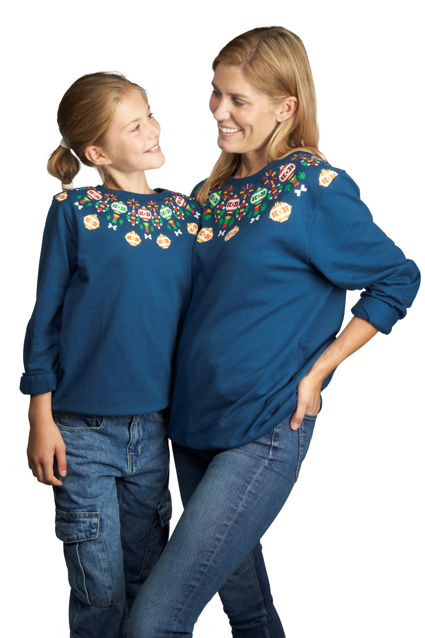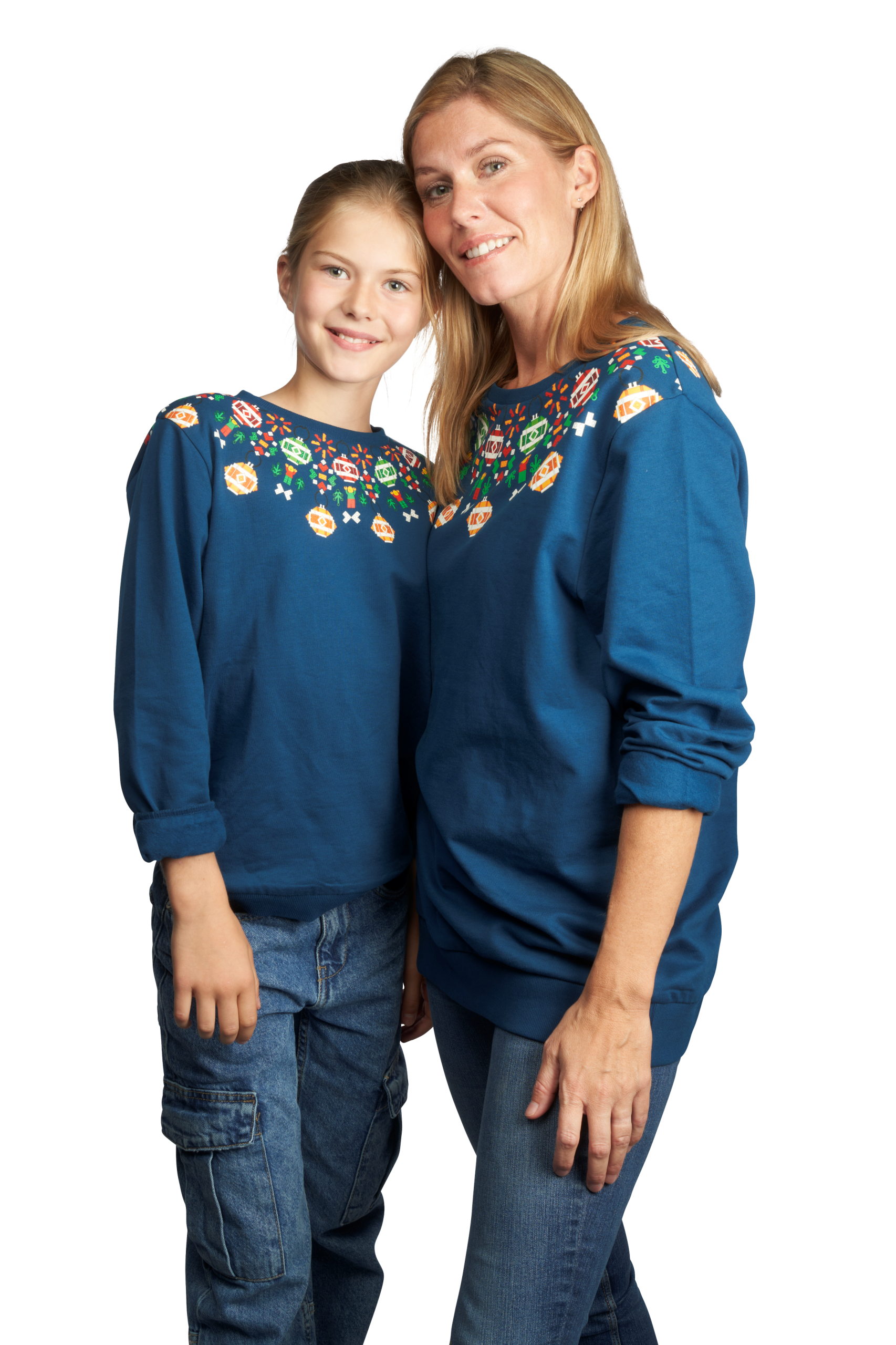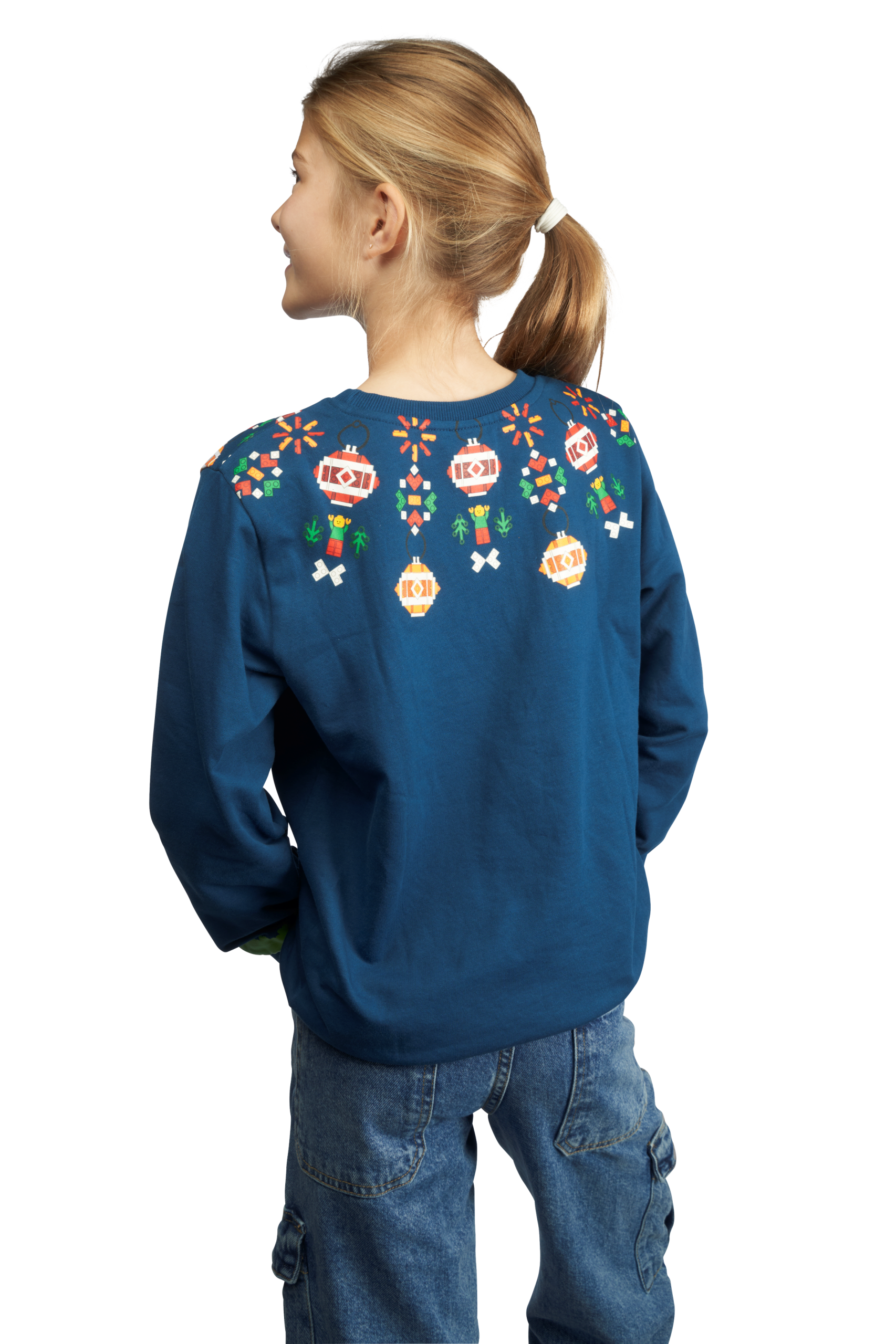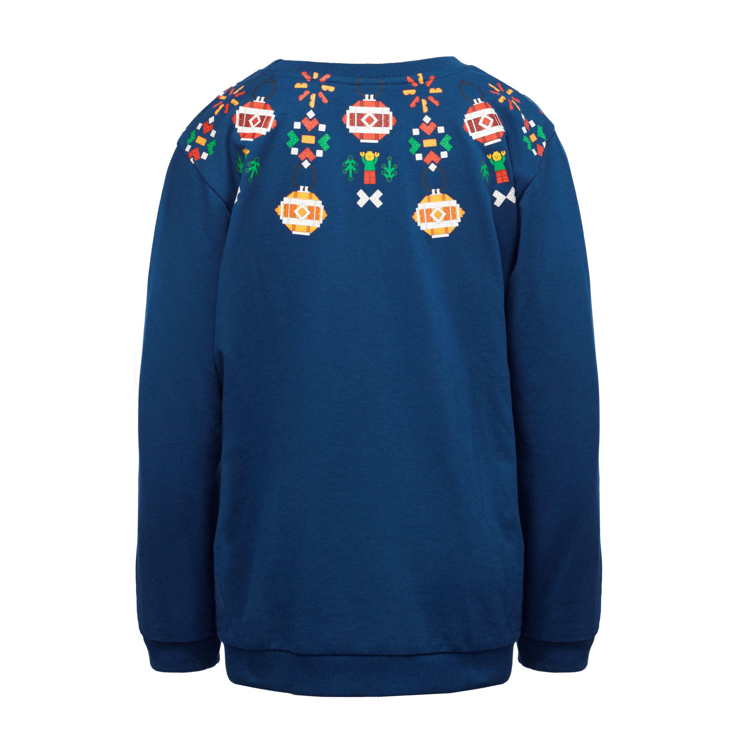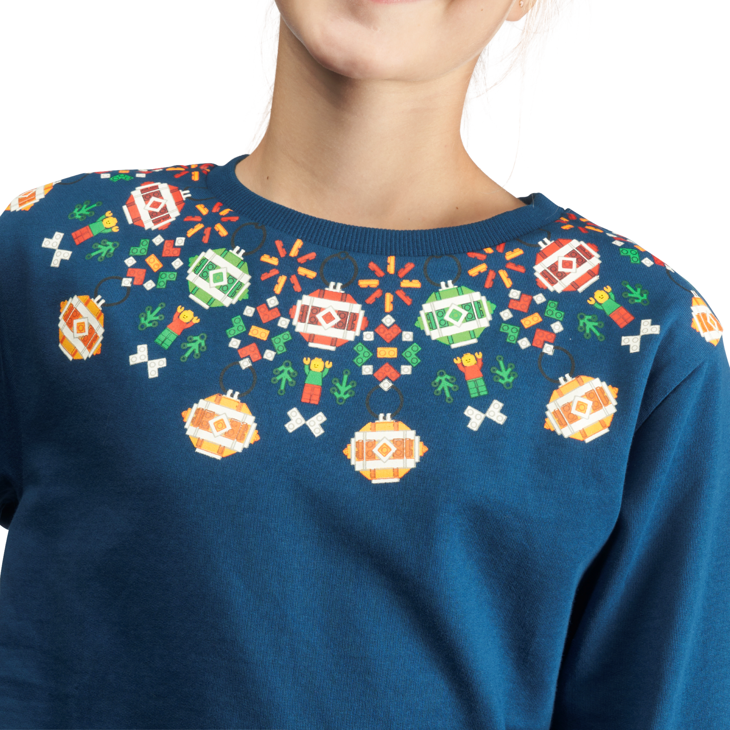 Celebrate the iconic LEGO® brick with this stylish blue LEGO Christmas jumper for kids. Machine washable and made from 100% cotton for ultimate comfort, it features illustrations on the front and back of Christmas ornaments and wreaths made of LEGO bricks. A fun gift idea for kids, this cool item of LEGO clothing is cut in a unisex style and is available in various sizes for ages 4 to 12. The model pictured is 128 cm tall and wears the 138/140 cm sweatshirt for ages 9 to 10.