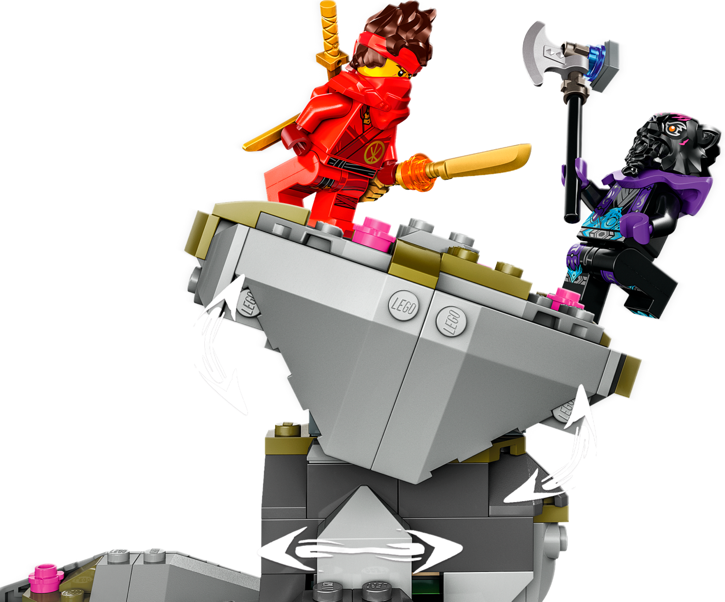 This buildable model comes with 6 NINJAGO character minifigures: Master Lloyd with a staff accessory, Master Wu with a spear accessory, Nya with 2 katana sword accessories and a pair of ninja sai, Kai with 2 katana sword accessories and a sword accessory, Euphrasia with a staff accessory and Lord Ras with his hammer. Kids have all they need to play out exciting ninja battles.