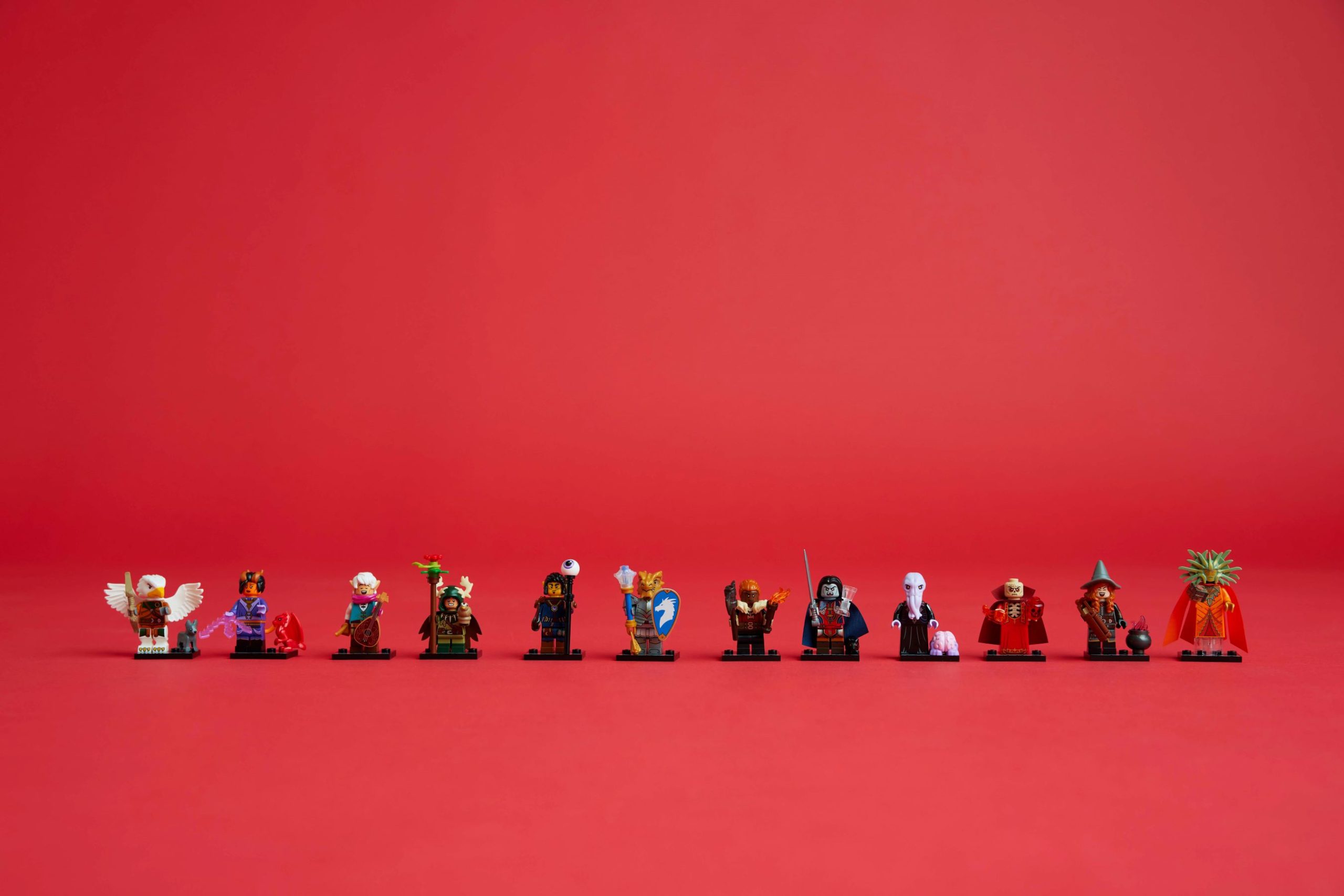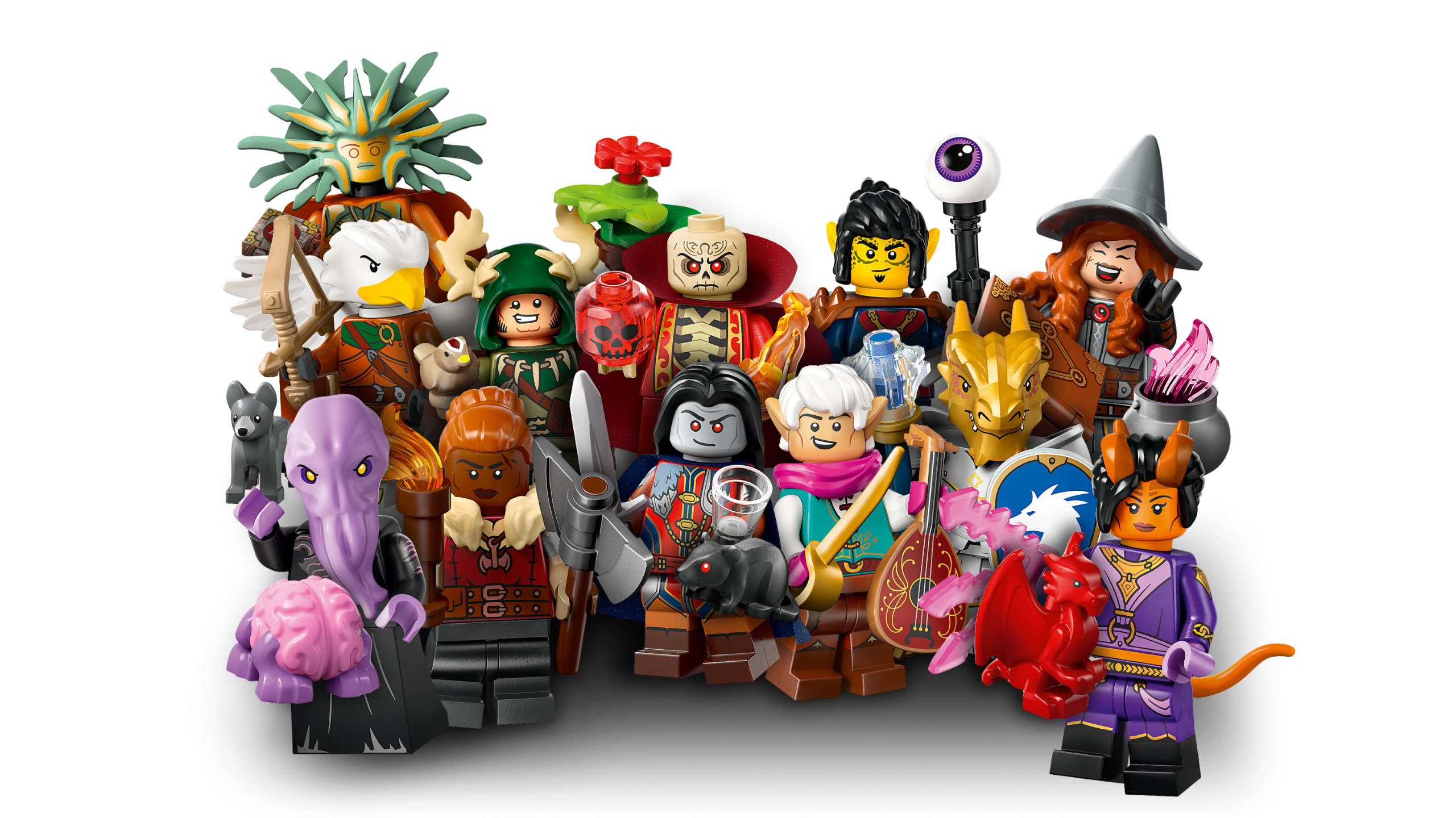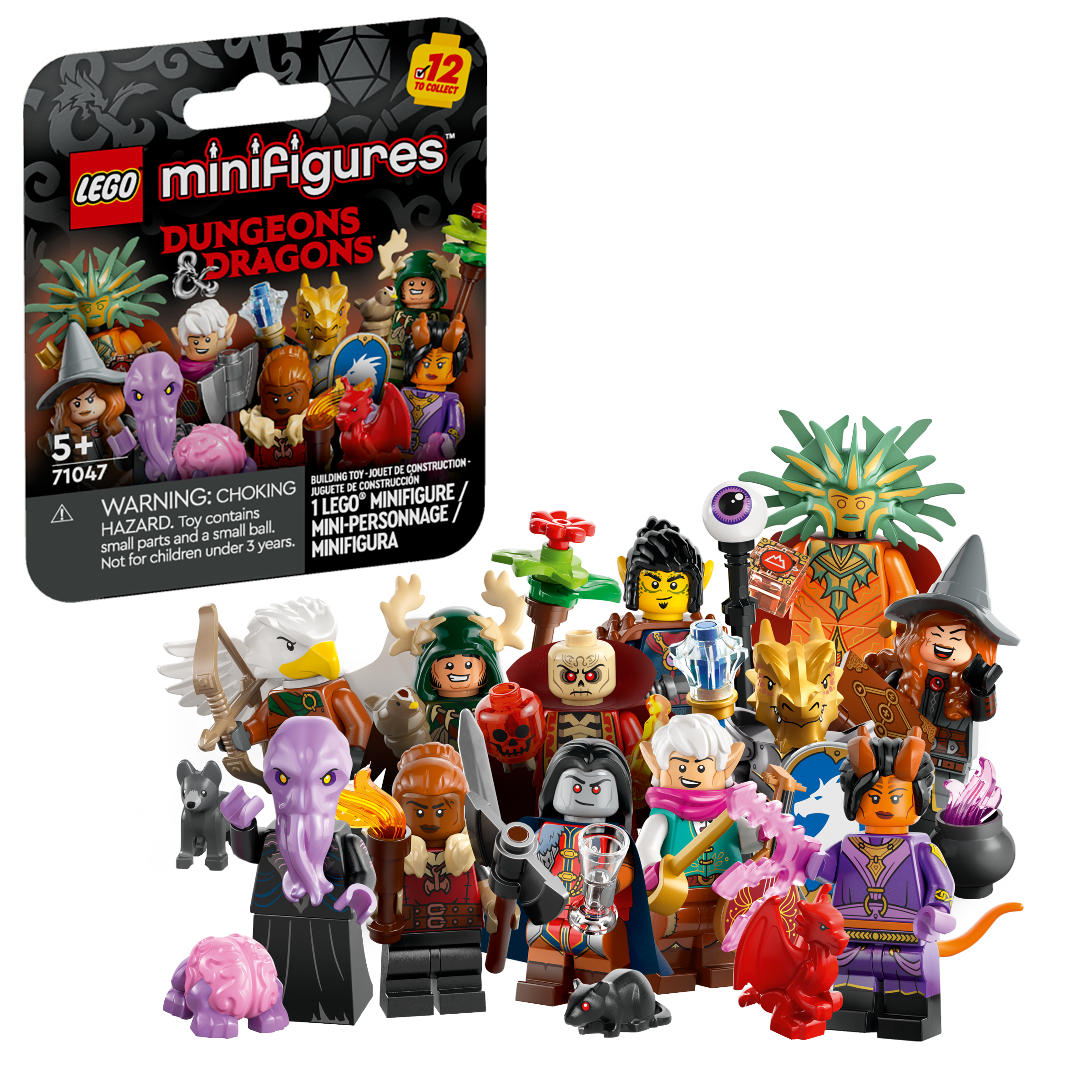 There is 1 surprise LEGO Dungeons & Dragons minifigure in each box and a total of 12 characters to collect: Tiefling Sorcerer, Elf Bard, Halfling Druid, Dwarf Barbarian, Dragonborn Paladin, Aarakocra Ranger, Gith Warlock, Mind Flayer, The Lady of Pain, Strahd von Zarovich, Tasha the Witch Queen and Szass Tam.
