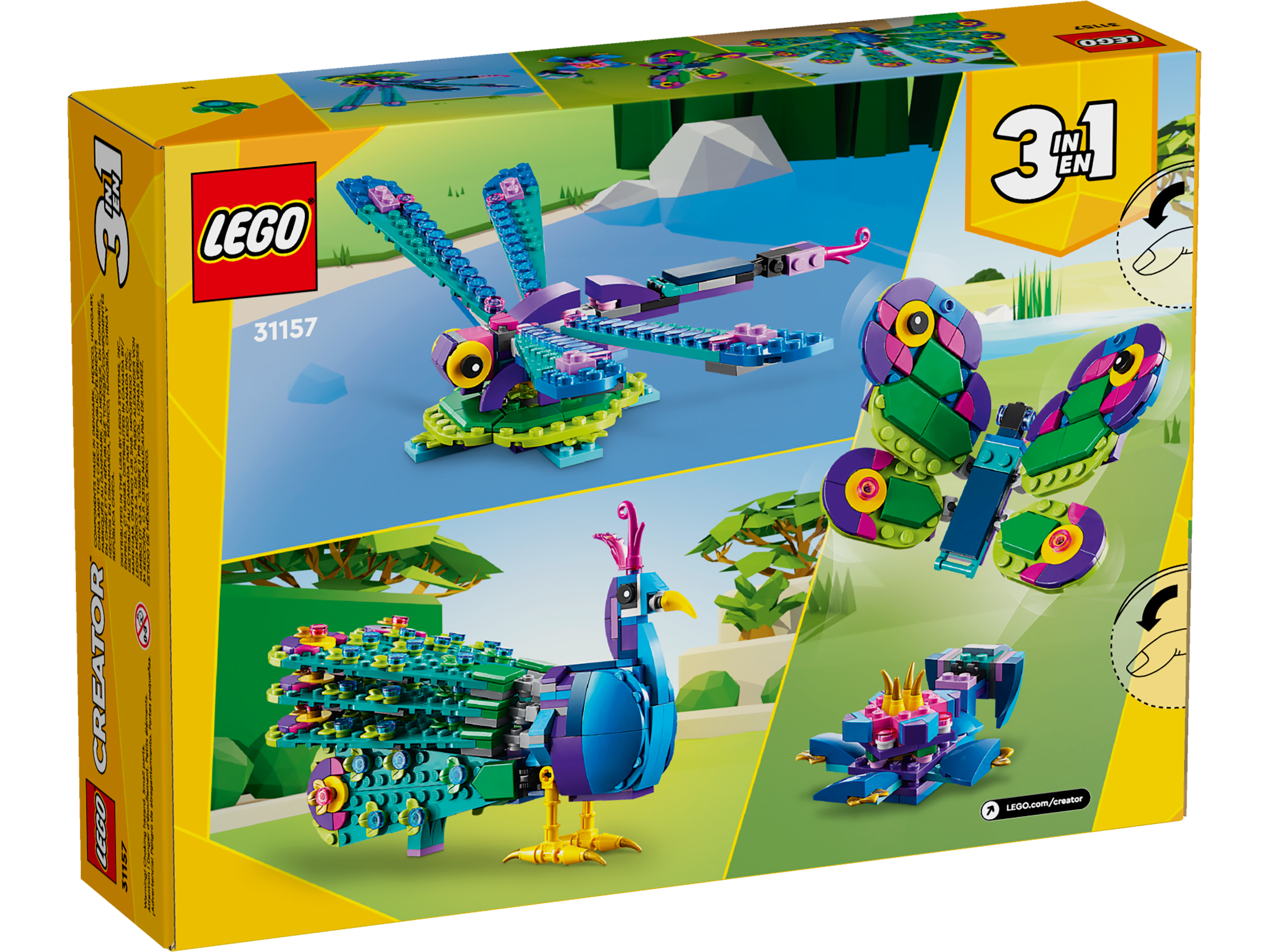 Boys and girls aged 7 can build, play with and display 3 different exotic LEGO® animal toys with this impressive Creator Exotic Peacock (31157) 3in1 building set. It features a peacock toy with a set of beautiful and detailed tail feathers that can be folded down or proudly spread out.