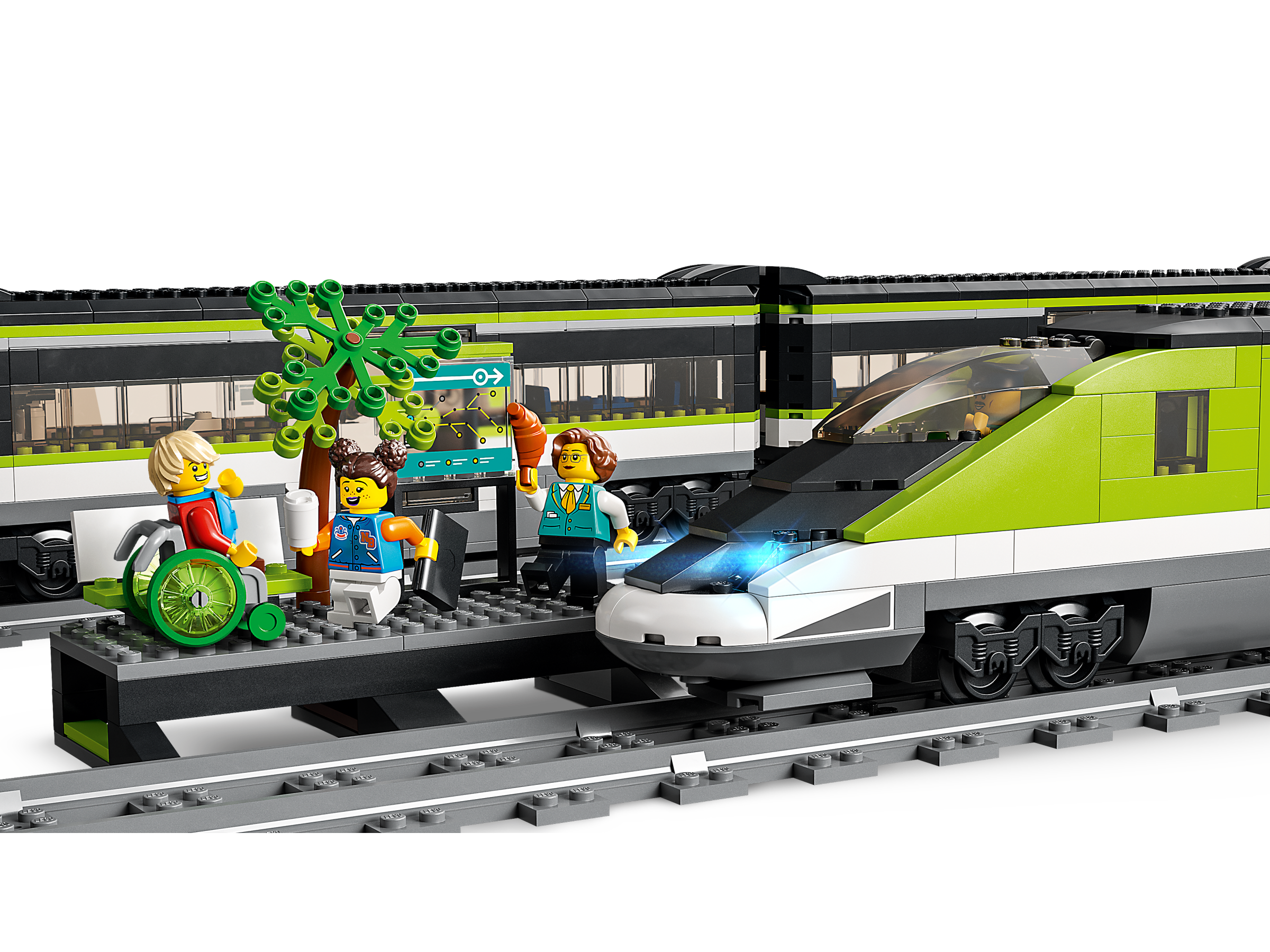 The LEGO® City Express Passenger Train set (60337) includes a remote-controlled bullet locomotive with working, dimmable headlights and LEGO Powered Up technology, a dining car, passenger car, station platform, 24 track pieces and 6 minifigures for endless hours of train-themed role play.