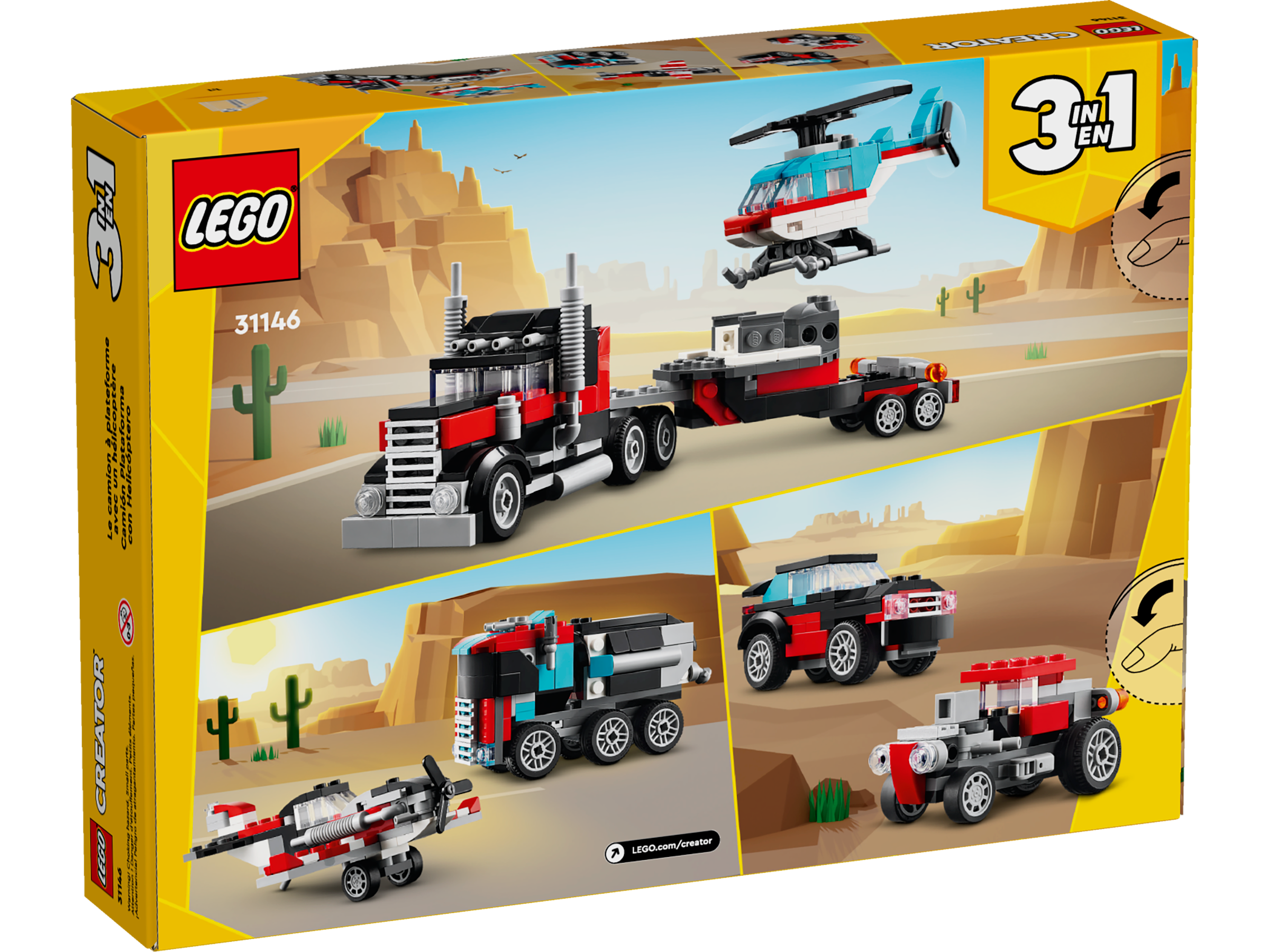 Fast-paced adventures await boys and girls aged 7 and over with the LEGO® Creator Flatbed Truck with Helicopter (31146) playset. They can use the 3in1 set’s 270 pieces to build a cool transporter truck toy with moving wheels that can carry a LEGO helicopter with moving rotor blades on its trailer.