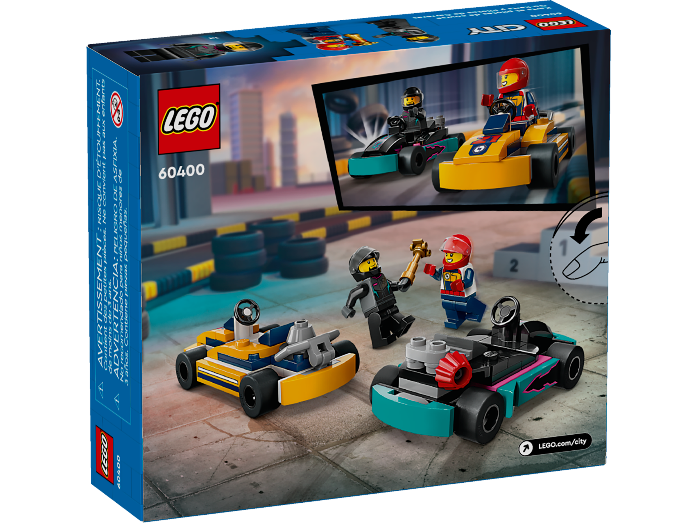 Fans of race car toys can enjoy endless action with this LEGO® City Go-Karts and Race Drivers (60400) toy vehicle playset for kids aged 5 and up. Little racers can choose between 2 driver minifigures before playing out exciting competitions with the orange and turquoise mini go-karts.This toy go-kart racing set makes a fun gift for kids and includes an easy-to-follow printed building guide, with digital instructions available in the LEGO Builder app. Using this intuitive building companion, kids can zoom in and rotate sets in 3D to visualize models from all angles as they build. The app also lets them track their progress and explore and save virtual playsets.Children grow up surrounded by amazing vehicles and machines and with LEGO City building sets they explore them up close with realistic models and fun characters that inspire open-ended, imaginative play without limits.