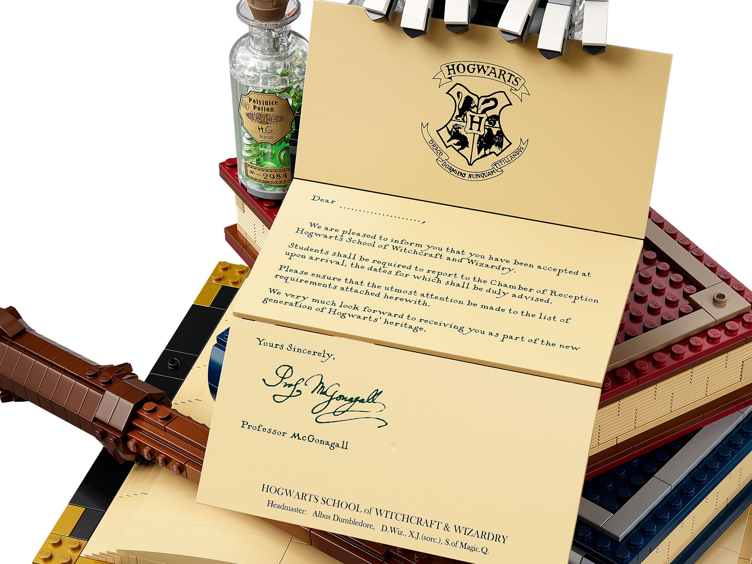 This homage to the Wizarding World of Harry Potter features many iconic artefacts in a single, stunning model. There’s Harry’s wand and glasses; Ron’s chocolate frog; Hermione’s potion tray containing 5 bottles of potions and magical ingredients (including Gillyweed, Felix Felicis ‘liquid luck’ and Polyjuice); Tom Riddle’s diary; the Golden Snitch; and a school scarf (customizable to suit any Hogwarts™ House). On top of this enchanting ensemble sits Hedwig™ the owl, holding a much-coveted invitation to Hogwarts. This fascinating model is accompanied by 3 exclusive golden minifigures – Albus Dumbledore™, Minerva McGonagall™ and Rubeus Hagrid™ – and a display stand with a decorated tile celebrating 20 years of LEGO Harry Potter.