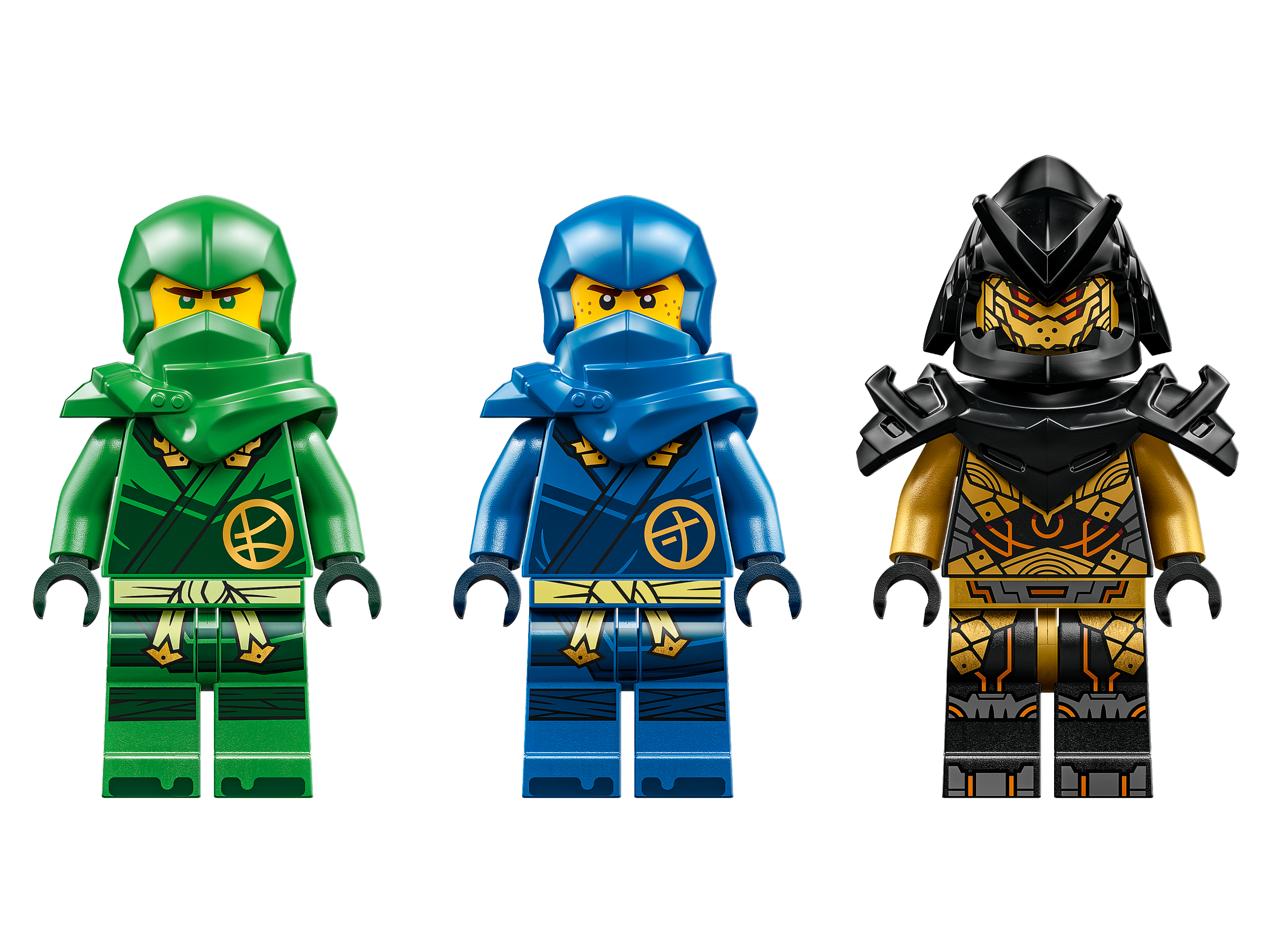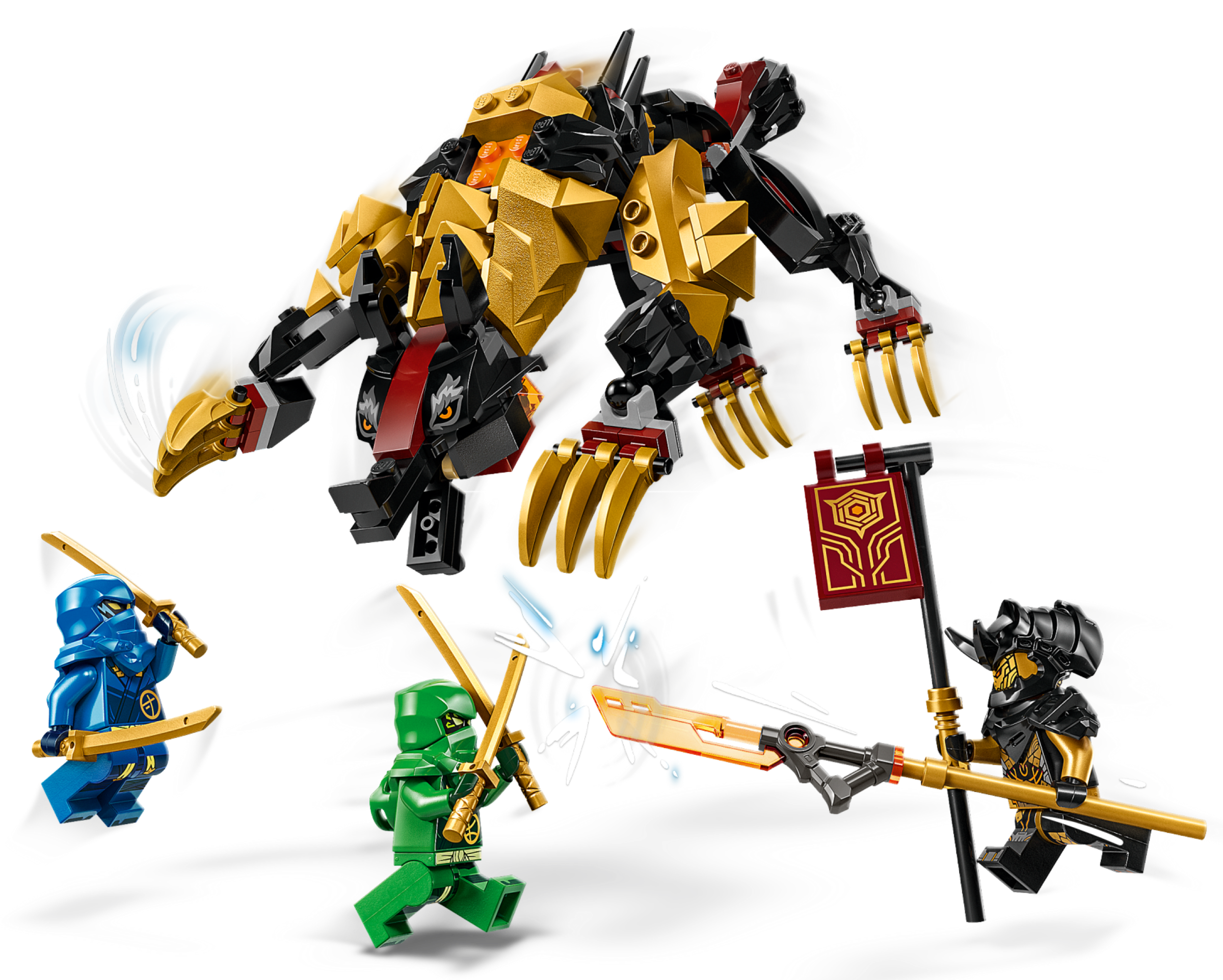 This LEGO® NINJAGO playset comes with 3 minifigures: ninja warriors Lloyd and Jay, who are armed with 2 katanas each, and the Imperium Claw General, who has large sword and can ride on the back of the Photac Beast using a saddle.