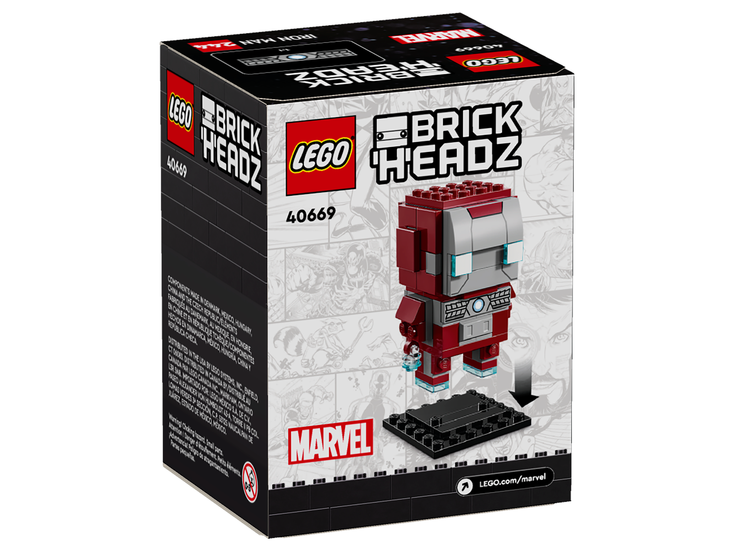 The authentically detailed LEGO® BrickHeadz™ Marvel Iron Man MK5 Figure (40669) wears his familiar Mark V (5) suit and has thrusters on his feet and hands. Standing firmly on a baseplate, the brightly colored BrickHeadz Iron Man is ideal for play and display, making a great gift for kids aged 10 and up who are fans of the Marvel Universe.