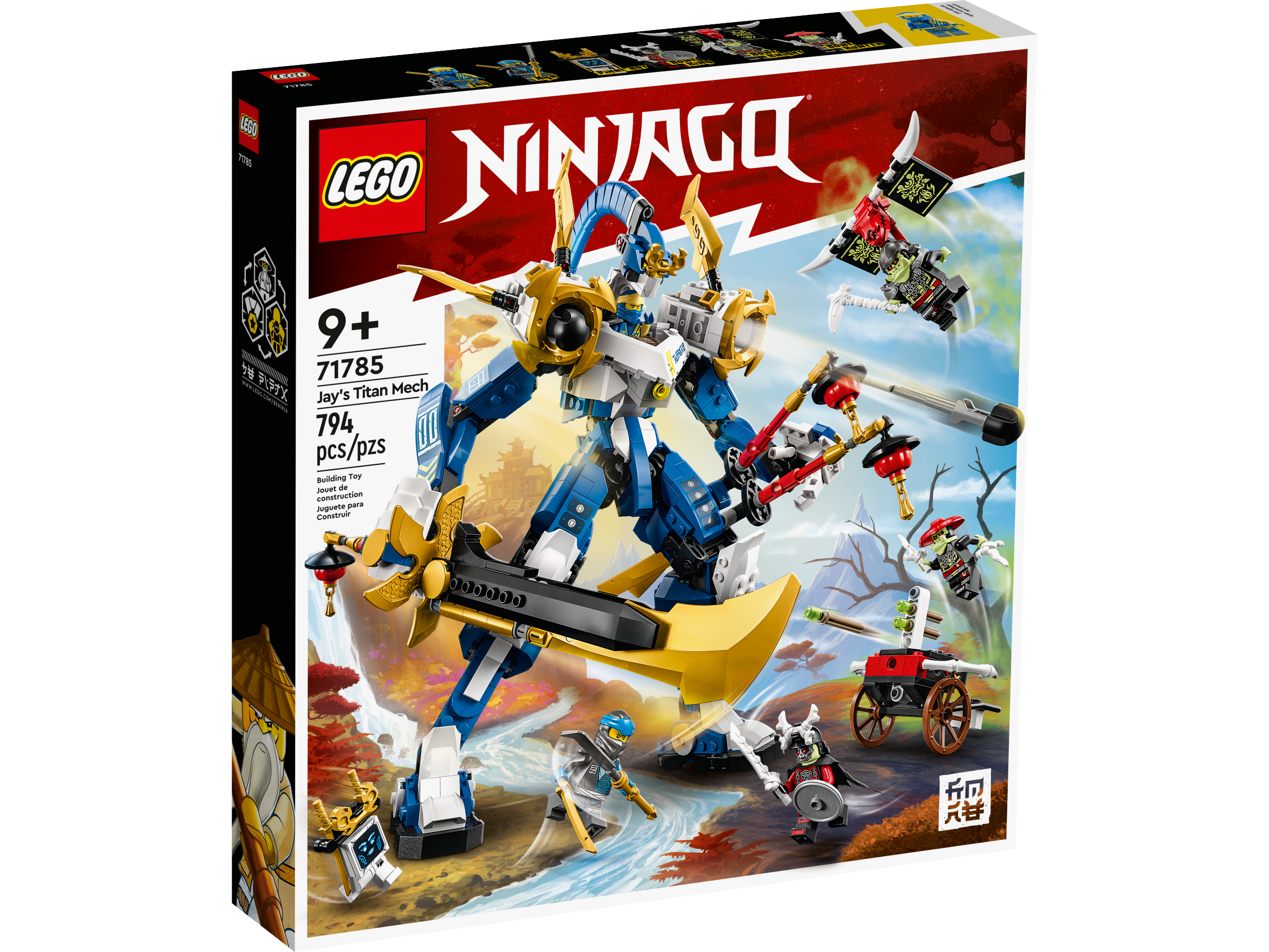 Kids aged 9 will enjoy playing out nonstop, gripping ninja action with this LEGO® NINJAGO® Jay’s Titan Mech (71785) building set. The posable toy mech features a cockpit on its chest for Jay, a large dragon blade, 2 katana swords and 2 shooters mounted on its shoulders.