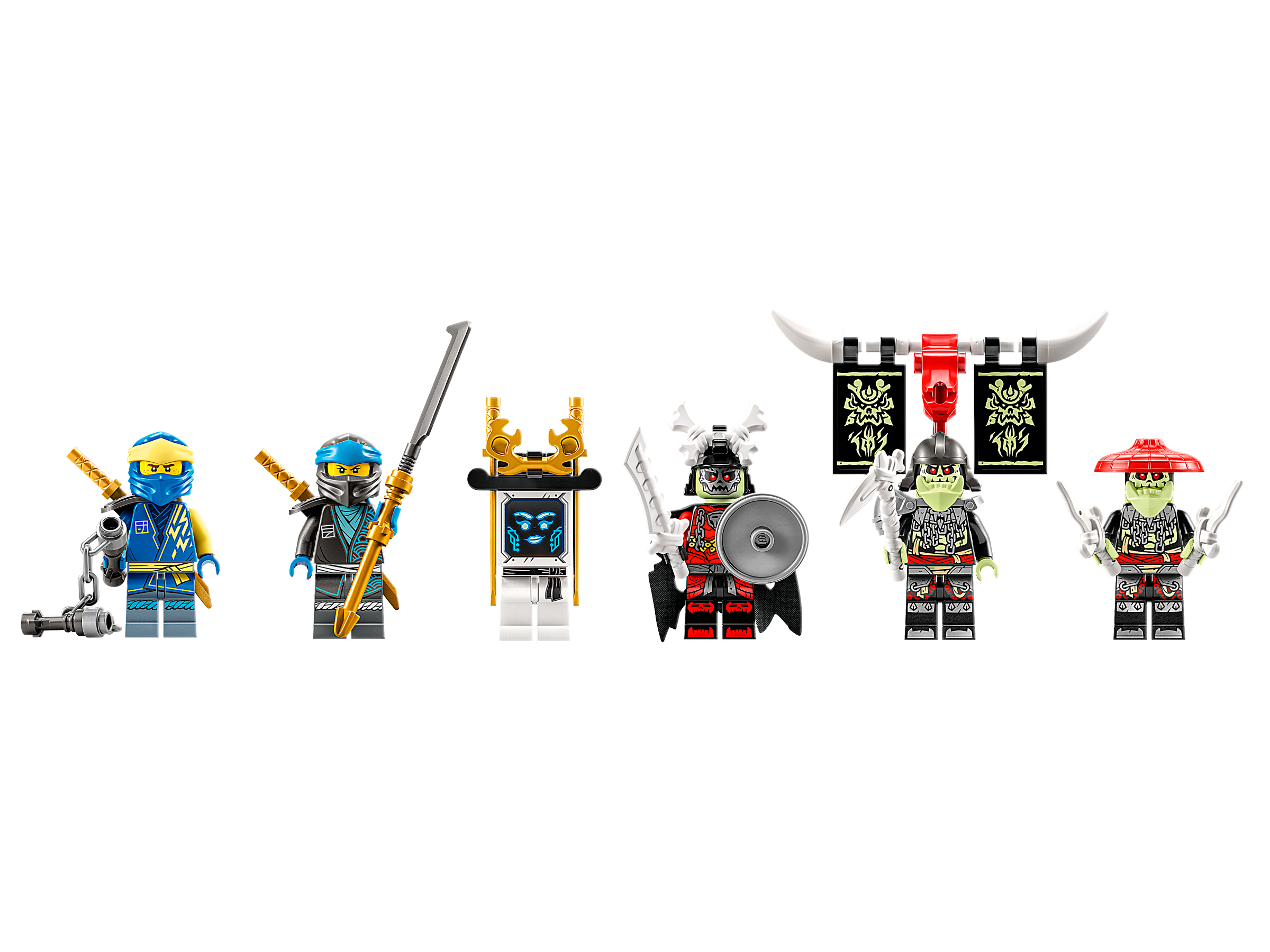 This cool toy playset for kids includes 5 minifigures: ninja warriors Jay and Nya, who are each armed with a sword, and green bone warriors Bone King, Bone Knight and Bone Hunter, who have their own weapons from the green bone warrior assorted weapons pack, plus a fast-firing double crossbow loaded with 4 darts and mounted on a wagon. There is also a Pixal Bot.