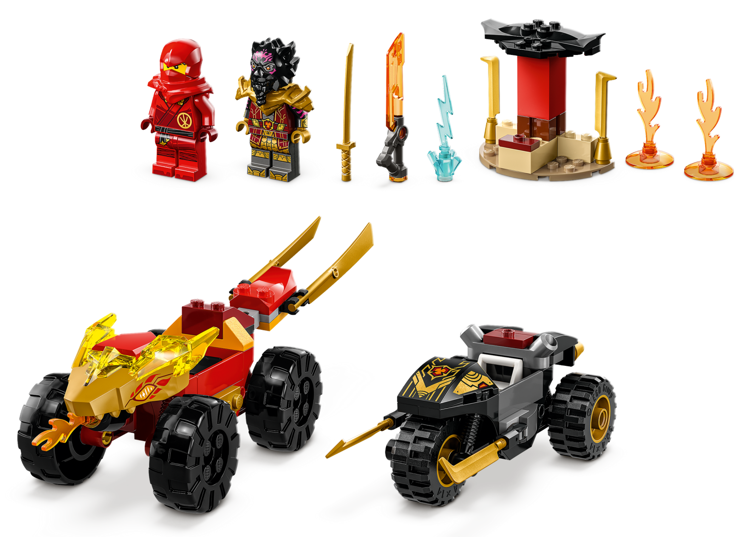 Kai and Ras’s Car and Bike Battle (71789) is the perfect way to introduce kids aged 4 to both the thrilling world of NINJAGO® and the joys of building with LEGO® bricks. The fantastic playset includes a dragon car, an all-terrain vehicle, Kai and Lord Ras minifigures, a piece of blue lightning in a display holder and 2 flame elements for kids to play out exciting action from the NINJAGO Dragons Rising TV series.