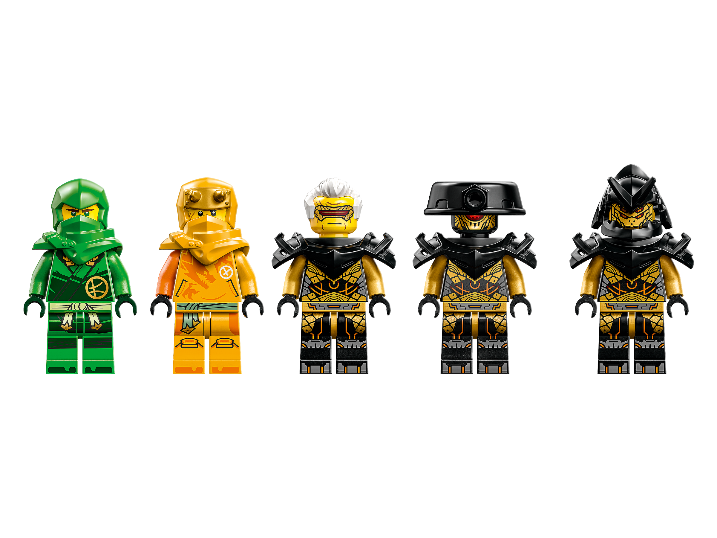 This mech playset comes with 5 minifigures. Ninja master Lloyd is armed with 2 katanas, while his ninja student Arin has 2 katanas and a grappling hook. They can battle the evil trio of Rapton, who is armed with an Imperium sword, Imperium Guard Commander, who comes with a staff, and Imperium Claw General with an Imperium sword. This set gives kids all they need to role-play countless action-packed clashes.