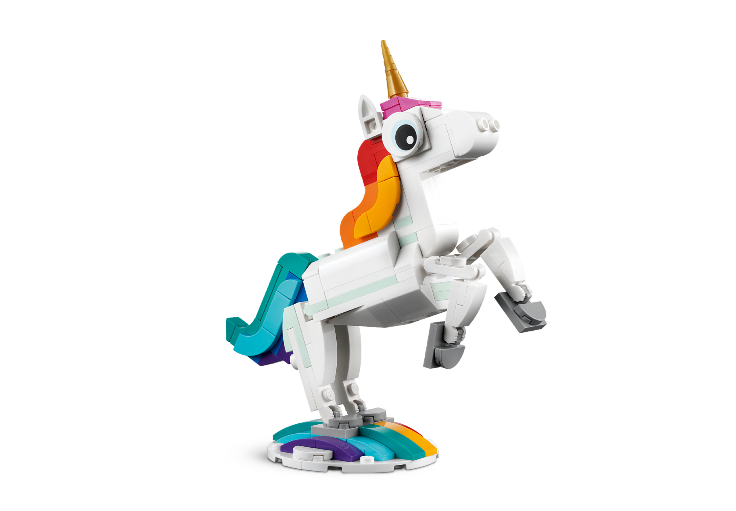 Imaginative kids aged 7 can be transported to a mythical land for enthralling action with this 3in1 Magical Unicorn (31140) building set. It features a unicorn toy with a golden horn, colorful tail, and posable legs and hooves. It can be presented in 2 different positions: standing on 4 legs or reared up on its 2 hind legs for an iconic pose and displayed on the set’s rainbow stand.