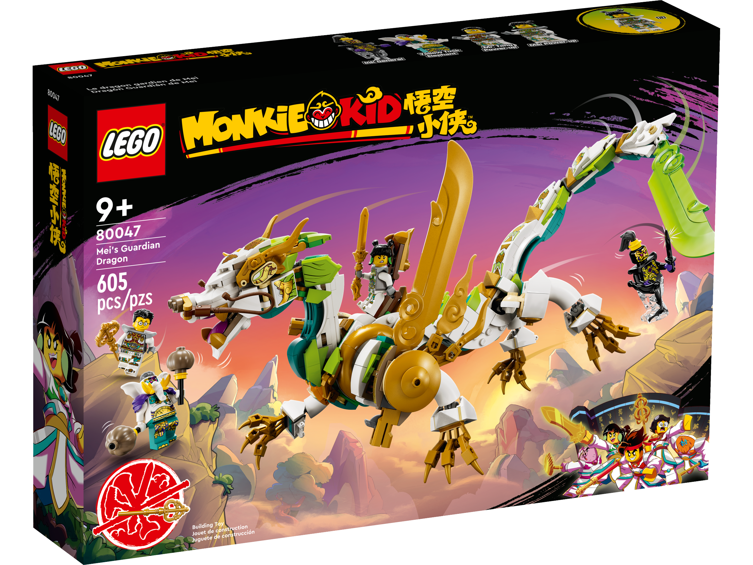 Give kids aged 9 and up hours of action-packed play with this LEGO® Monkie Kid™ Mei’s Guardian Dragon (80047) toy set. The dragon is articulated and posable and has 2 stud launchers on its wings, a saddle and a movable tail to foster adventurous play. The set also includes Mei’s sword, Mr. Tang’s ancestral weapon, plus an ‘ink’ stud launcher for Ink General.