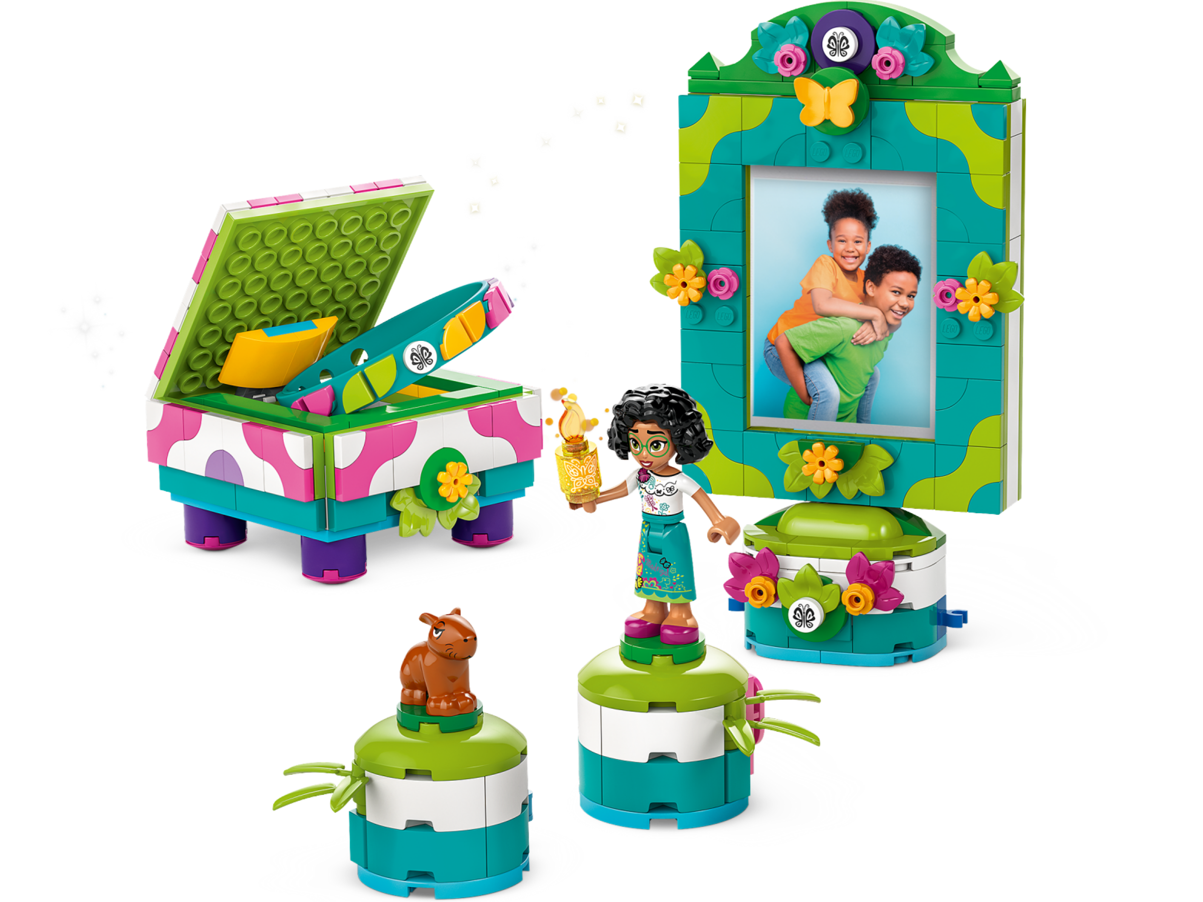 Appeal to fans and kids aged 6 who love Disney movies with this creative LEGO® ǀ Disney Encanto Mirabel’s Photo Frame and Jewelry Box (43239) buildable toy. Featuring a jewelry box with room for the included bracelet, plus a photo frame and standwith extra clips for small photos and 2 spots for the Mirabel LEGO ǀ Disney mini-doll figure character and LEGO ǀ Disney capybara figure.