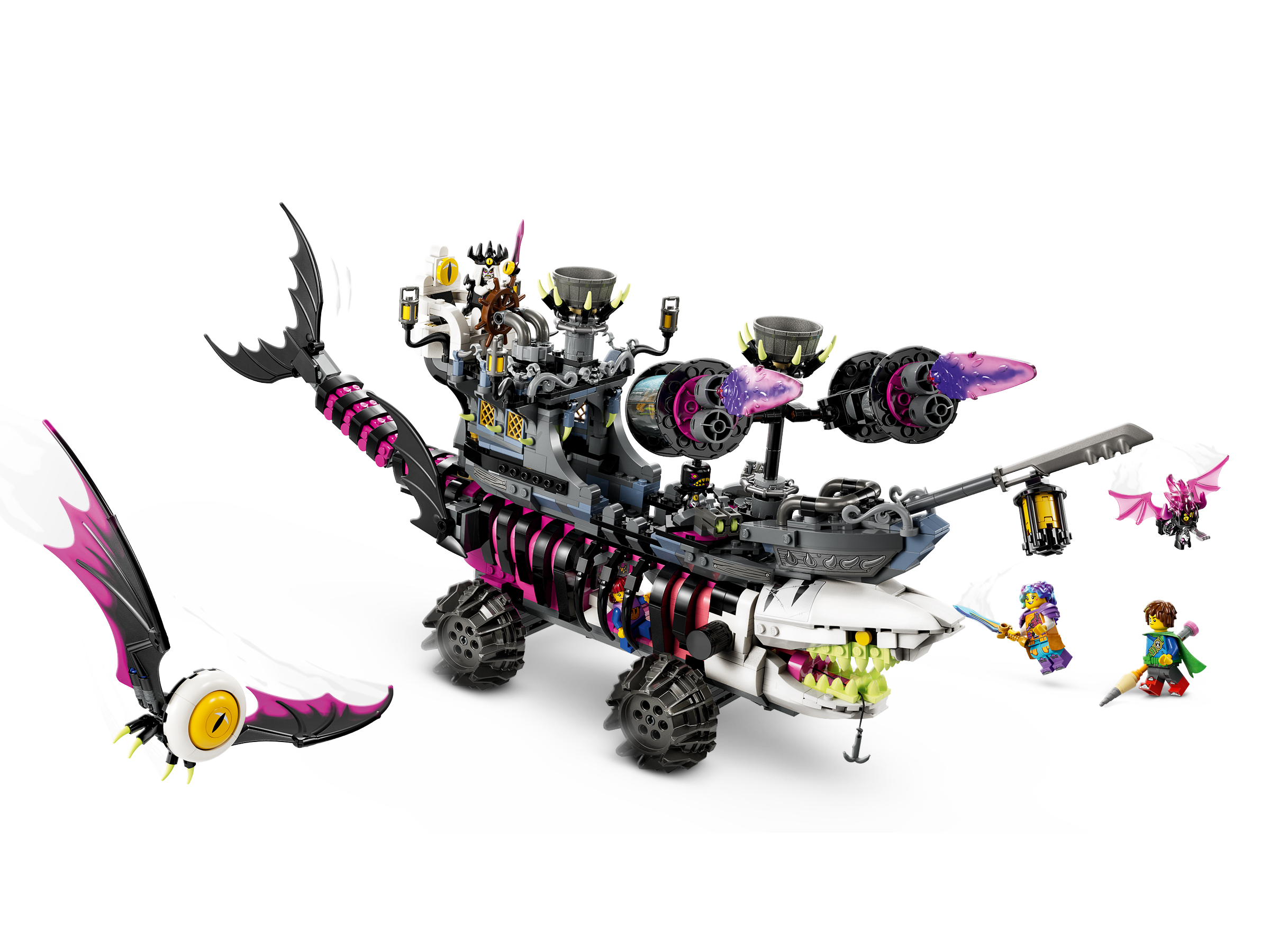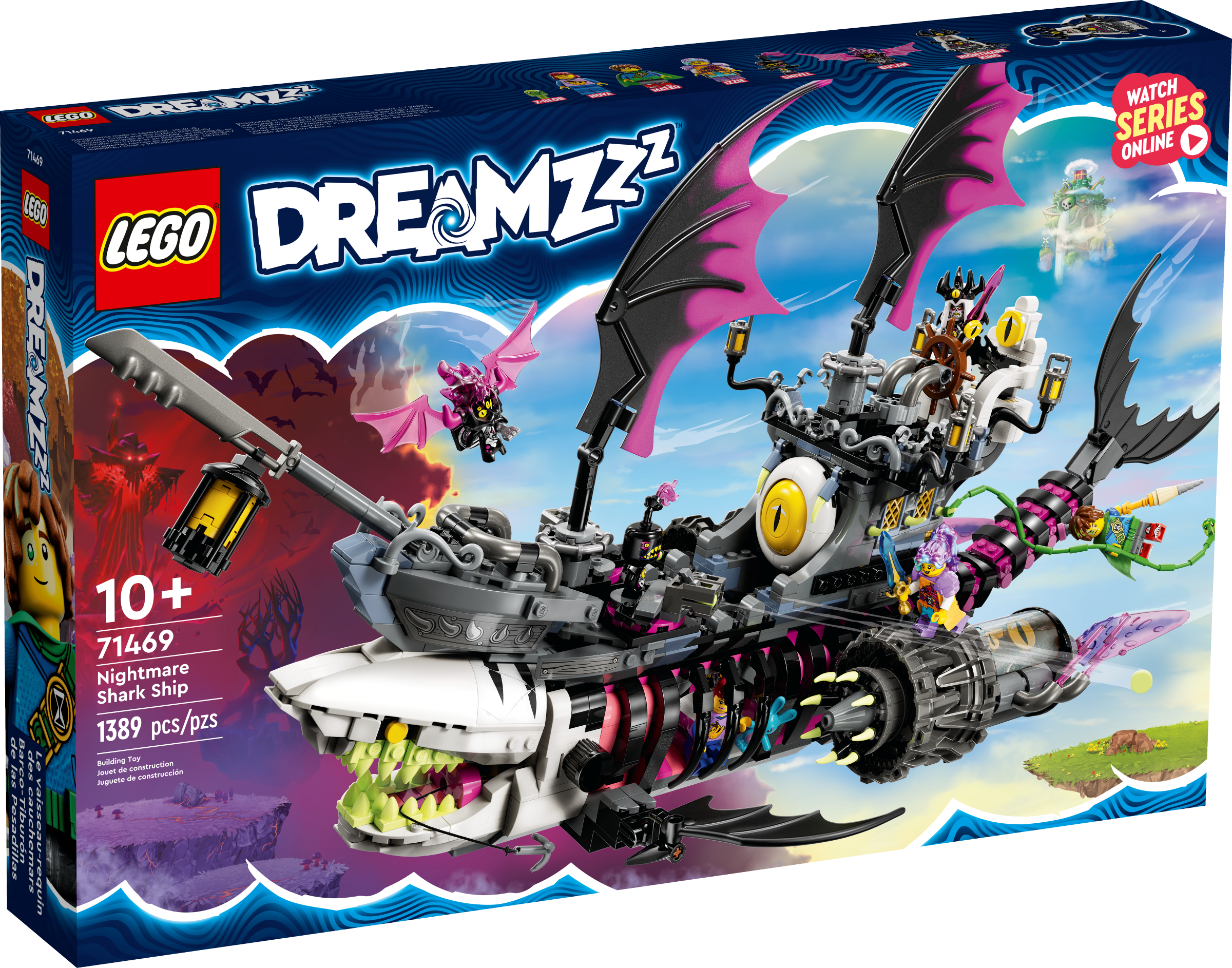 Kids aged 10 dive into the action of the dream world with this LEGO® DREAMZzz™ Nightmare Shark Ship (71469) building toy set. The Night Hunter has captured Izzie’s favorite plushie and combined it with a pirate ship to create a lethal monster vehicle, which kids can now build.1 vehicle, 2 ways to buildKids can choose to build the vehicle in 2 ways – ship mode or tank mode. Ship mode has powerful engines and sails, while tank mode has cool accessories and flying eyeballs. The 2 building options encourage creativity and provide double the playtime.Cool featuresThe shark ship is bursting with cool features that kids will love. They can open its jaw and place a minifigure inside, push a button to discover a secret treasure chest, remove the rear cabin and more. It’s also equipped with turrets on both sides that can swivel and fire, and it features a cage and trapdoor at its center.