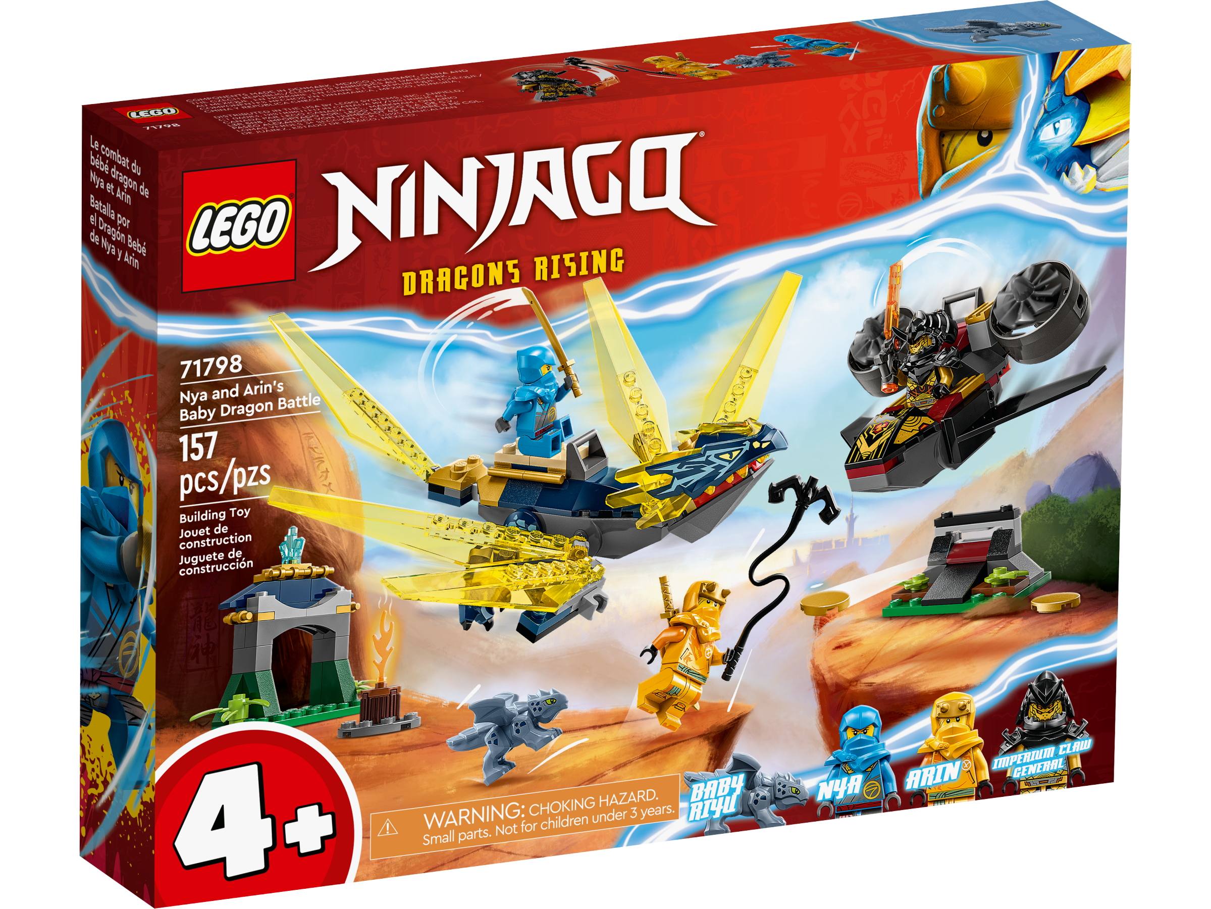 Nya and Arin’s Baby Dragon Battle (71798) playset is the ideal way for kids aged 4 to learn how to build as they recreate amazing scenes from the NINJAGO® Dragons Rising TV series. The action-packed building set features 2 dragons, a jet plane and a hideout cave with energy crystals, plus 3 minifigures to inspire countless hours of gripping role play.
