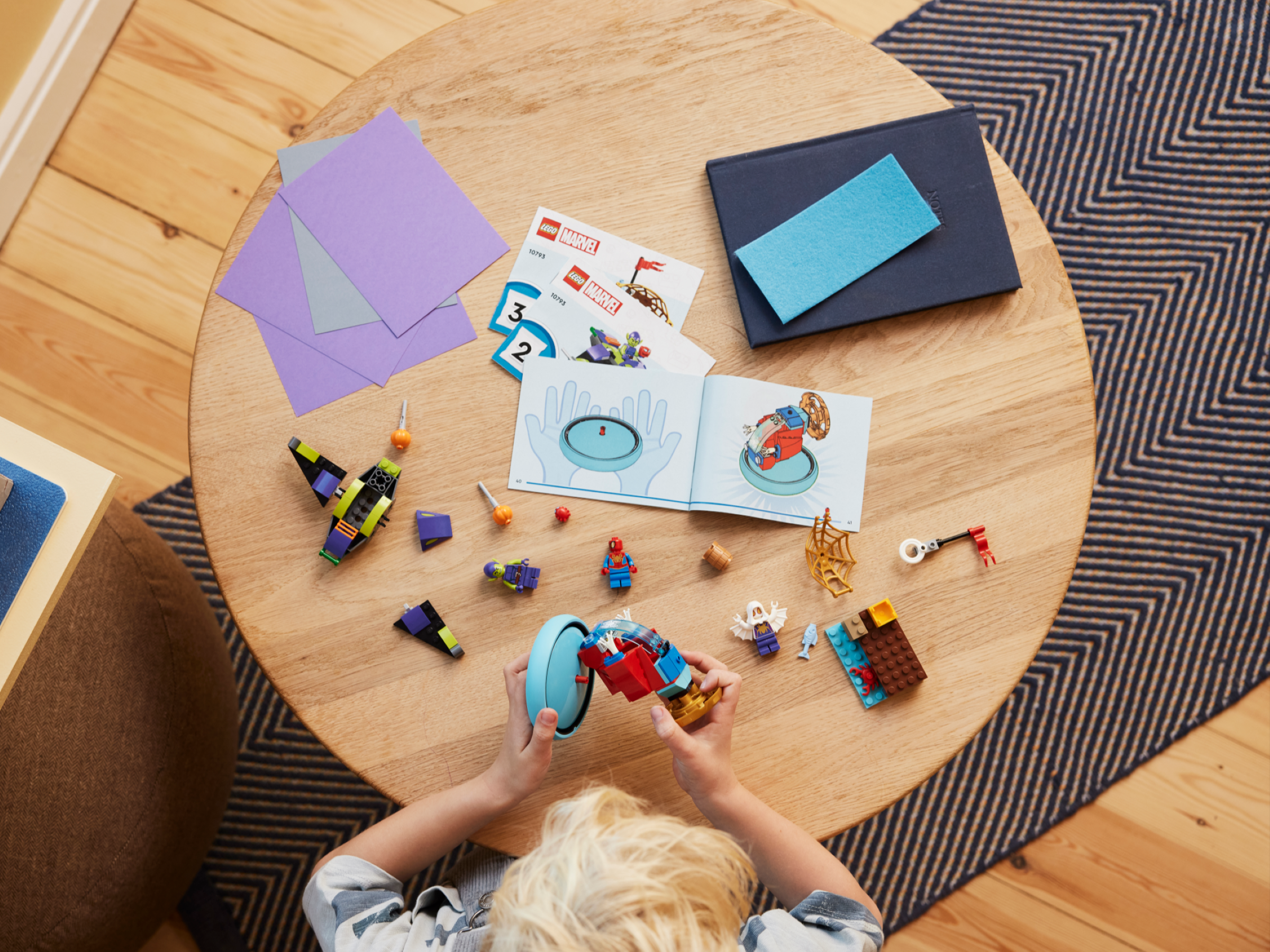 This Disney Spidey and His Amazing Friends toy vehicle set includes: a Spidey minifigure and his hover spinner with rotating propeller and lift-up cockpit; a Green Goblin minifigure and his glider with pumpkin projectiles; and a Ghost-Spider minifigure with her large, golden web element. There’s also Spidey’s robot friend Trace-E, sea accessories and a cute crab. The set comes with a cockpit Starter Brick to help get building underway and intuitive instructions in the form of a colourful picture-story guide.