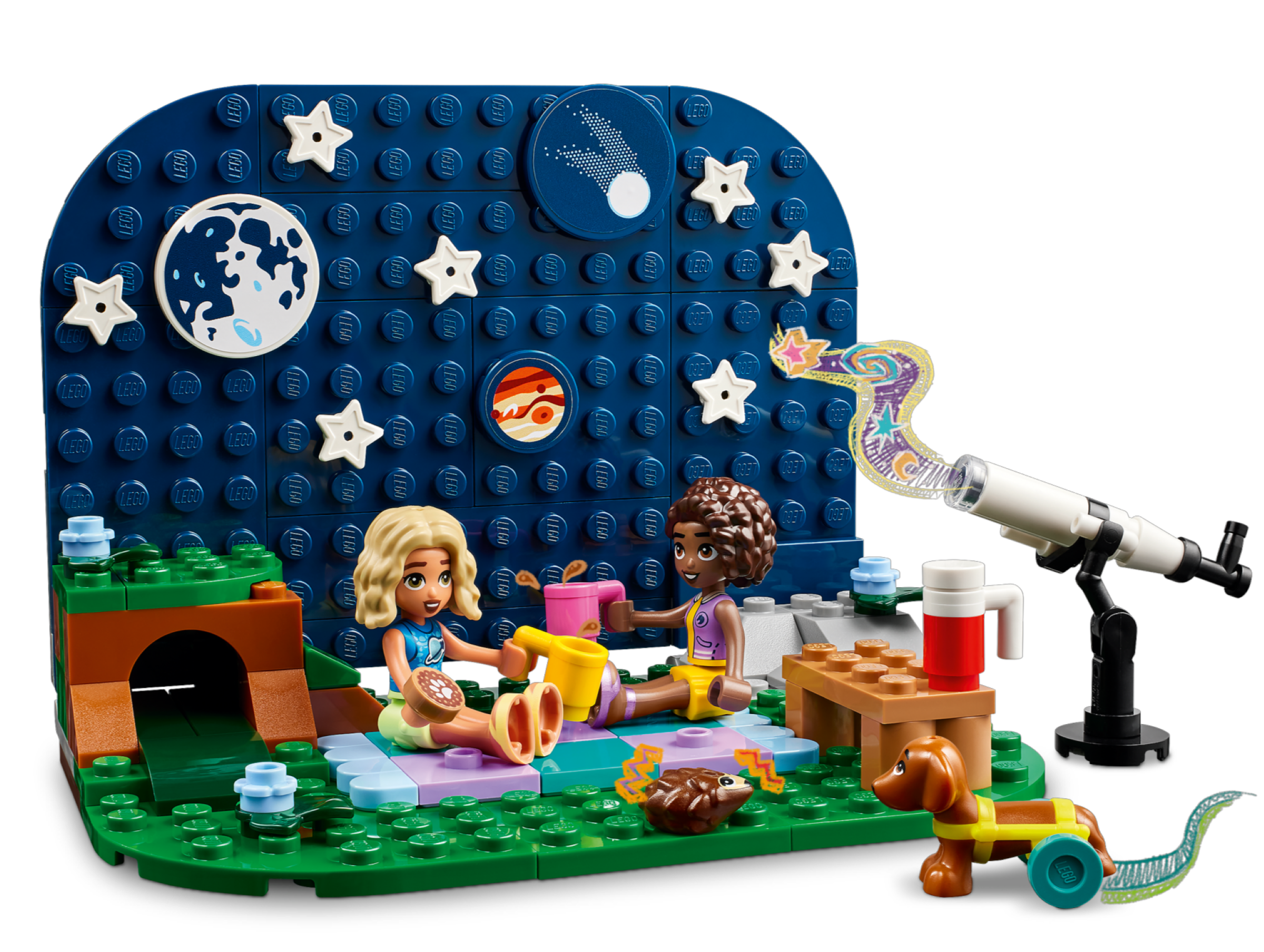 Kids who love adventure toys have lots to discover with this LEGO® Friends Stargazing Camping Vehicle (42603) playset for girls, boys and kids aged 7 . The set includes a buildable toy telescope, a 4×4 vehicle with camping trailer and self-folding tent, 2 mini-dolls, a dog figure and a hedgehog figure.