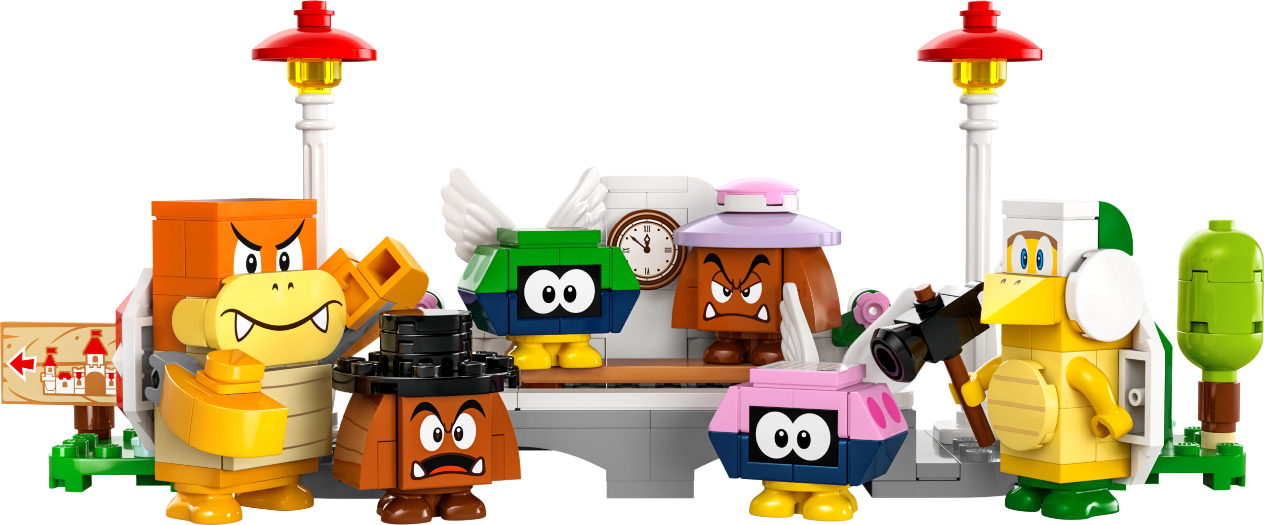 Add a LEGO® Mario™, LEGO® Luigi™ or LEGO® Peach™ figure (not included) for interactive play. Help them to chase the train in the handcar, operate the spinning platform on the locomotive and activate the cannon wagon’s spring-loaded shooter. Once all the enemies are defeated, trigger horn sounds as they drive Bowser’s Express to the station.