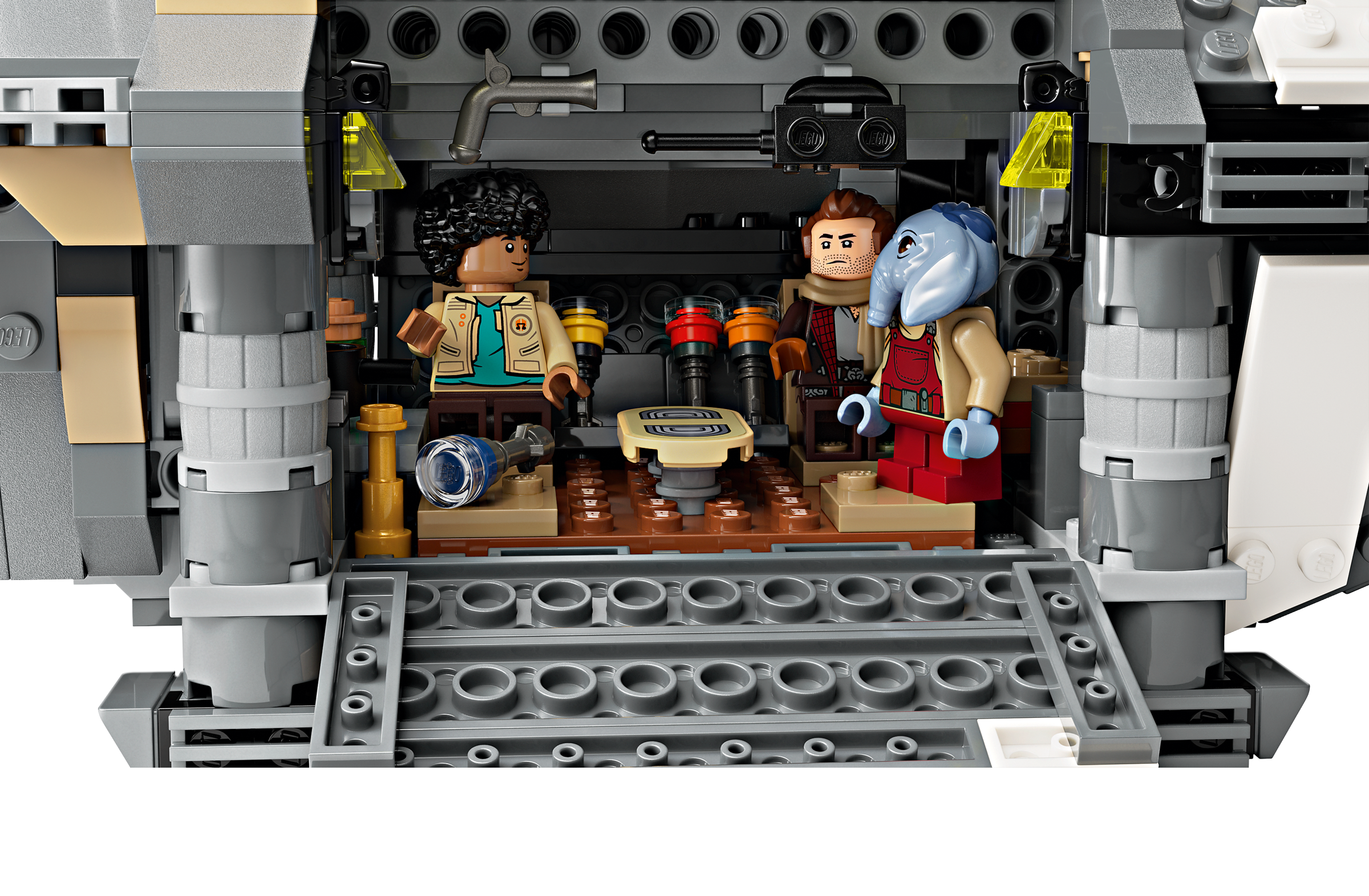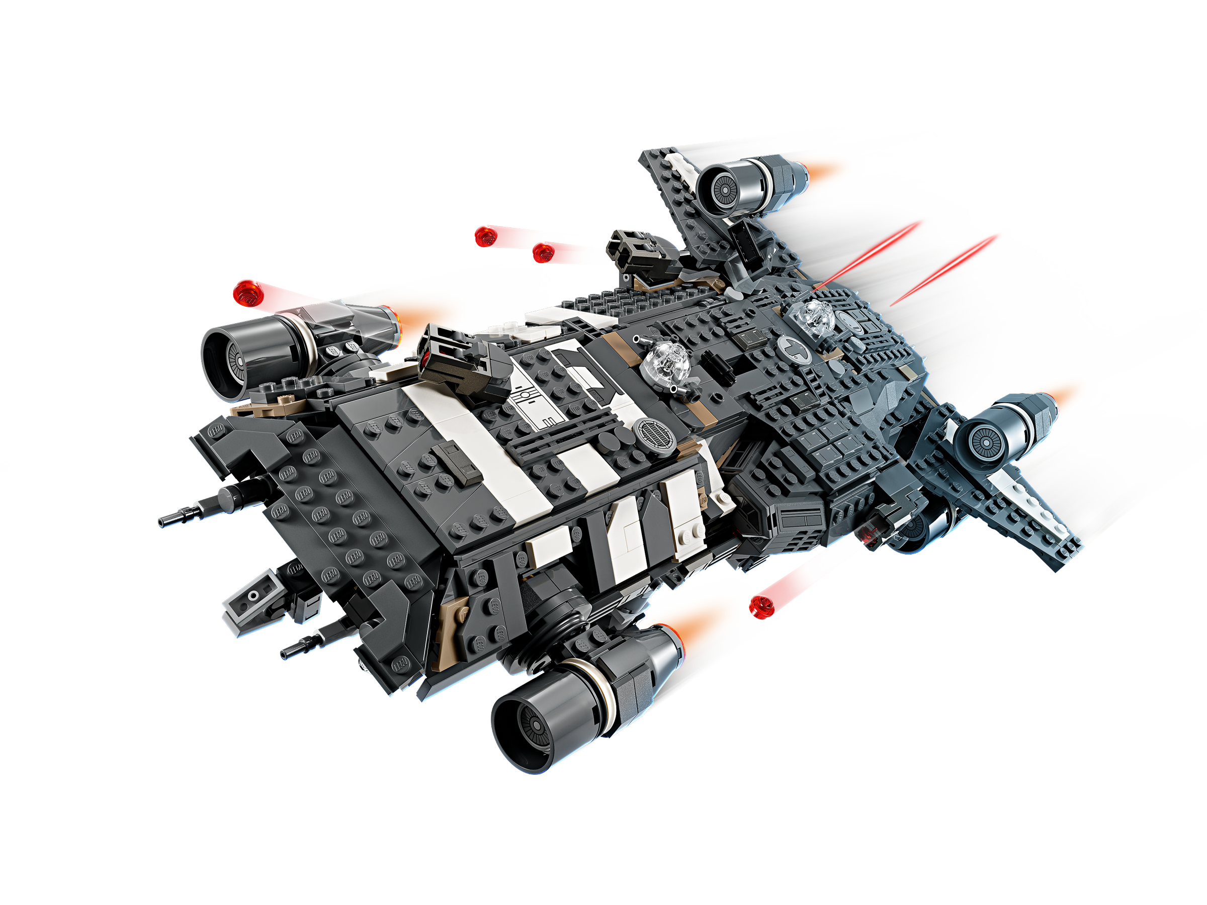 Kids become the heroes in their own Star Wars: Skeleton Crew stories with a detailed LEGO® brick recreation of The Onyx Cinder (75374). This collectible LEGO Star Wars™ buildable starship toy features rotating engines for landing/takeoff or flight, 2 stud shooters, 2 rotating turrets, each with 2 stud shooters, and a grabbing claw. It has seats for all 5 included LEGO Star Wars characters (the Jod LEGO minifigure in the cockpit and Wim, Fern, KB and Neel in the passenger compartment), plus storage for the 4 buildable torches and other cargo. There is also a kitchen table and a bed, plus accessory elements including fruit and a walkie-talkie to inspire creative play.