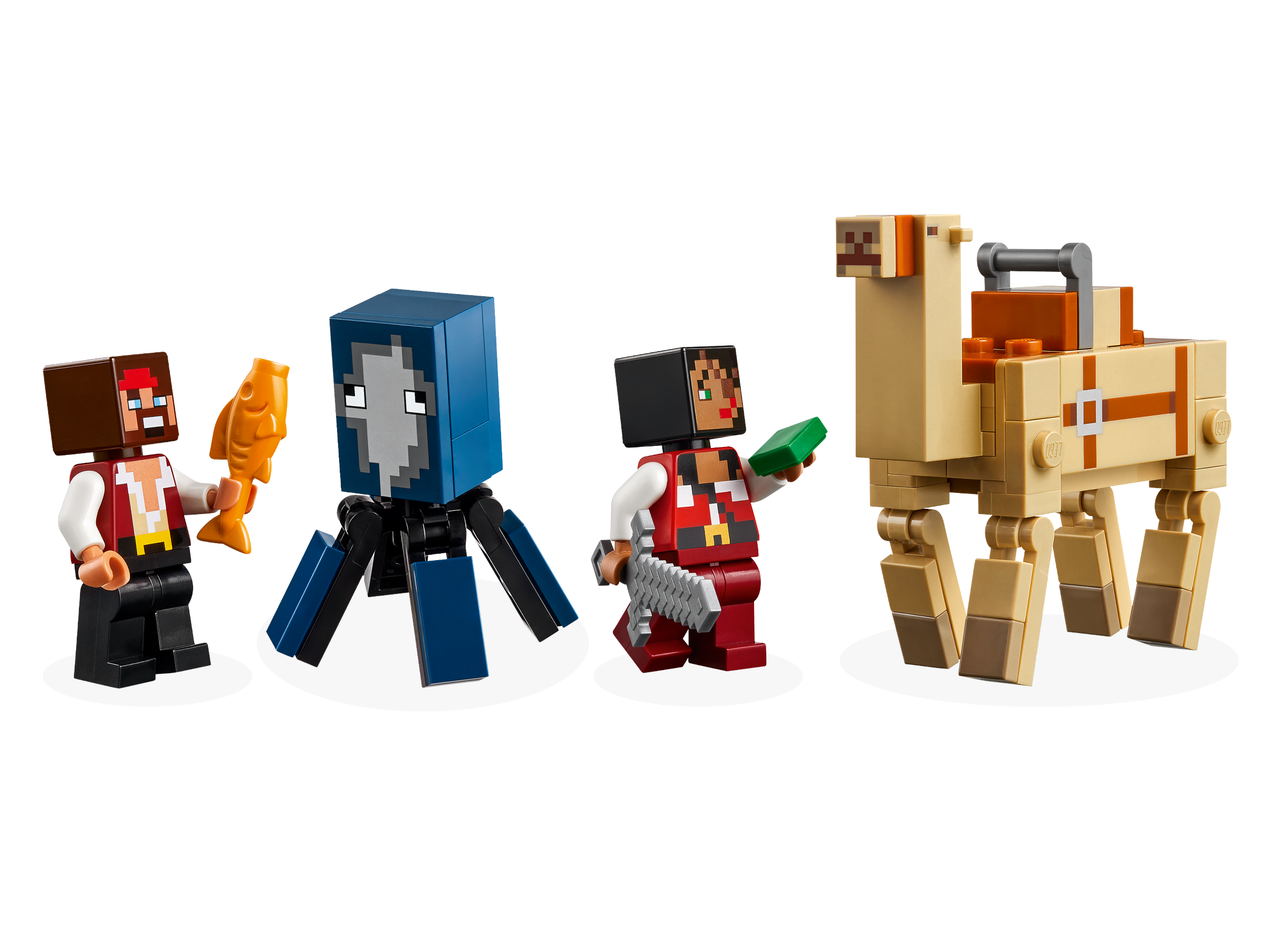 This LEGO Minecraft pirate adventure set includes a buildable vehicle toy, plus a squid, camel, 2 pirate figures and accessories. Featuring pirates and a boat, and the first-ever appearance of an adult LEGO Minecraft camel, this special LEGO set will appeal to Minecraft fans. The camel’s 2-seat saddle has room for both pirates to ride to their next adventure. Accessories, including a fish, map, iron sword and a cactus help inspire imaginative play. The set combines easily with other LEGO Minecraft sets (sold separately) for even more play possibilities.