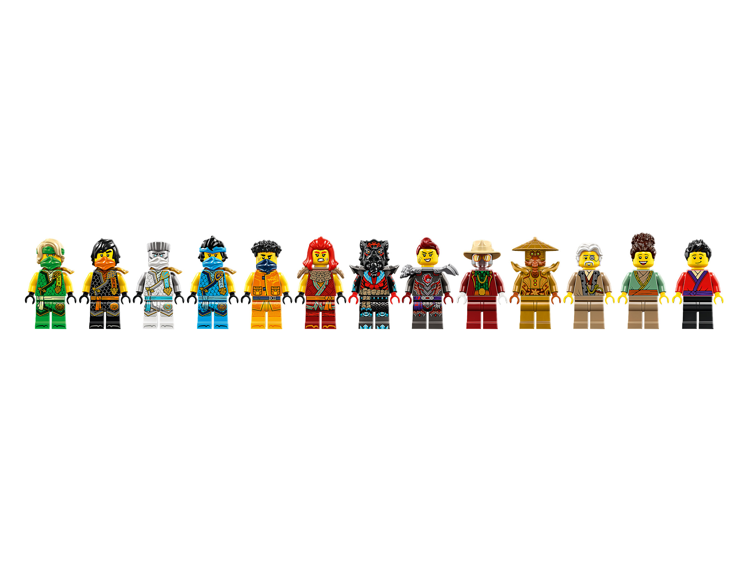 This buildable ninja toy for kids comes with 13 NINJAGO minifigures: Lloyd, Cole, Nya, Zane, Arin, Wyldfyre, Lord Ras, Jordana, Mr. Pale, Blacksmith, a Temple Guard, Roby and Bleckt. There is also an airship and a posable dragon toy with blade-style wings.