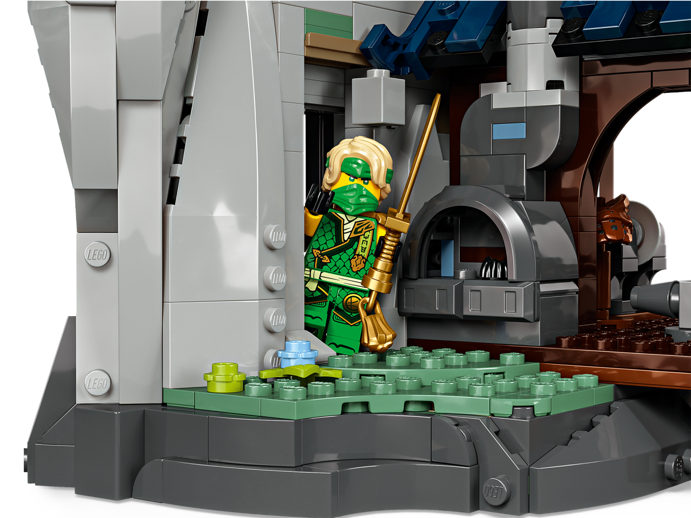 The NINJAGO temple built into a rock face features a 4-tiered pagoda, a bridge, a water mill kids can turn to move 2 battle platforms and a blacksmith’s hammer, plus falling rocks that are activated by pressing a lantern, hidden storage and a secret door. Kids can turn the temple around, where its open back provides extra play options and the chance to create fun little stories.