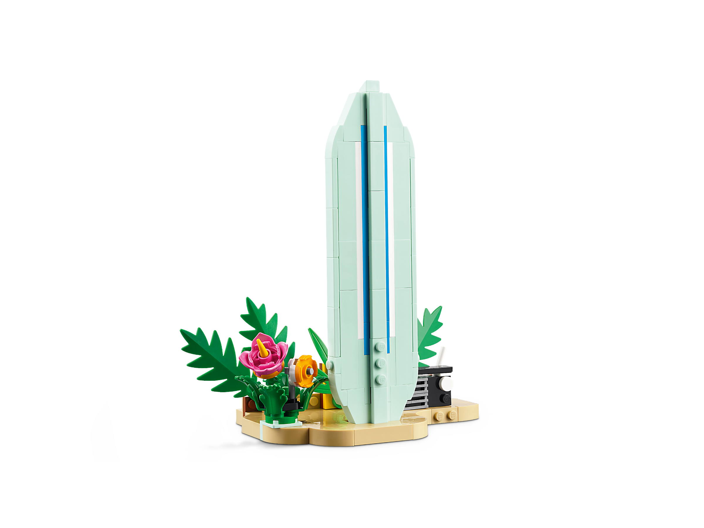 This LEGO Creator 3in1 set gives kids 3 different build-and-play experiences using the same bricks. They can build a ukulele instrument toy, rebuild it into a small leaping dolphin toy on an ocean and beach stand, with a palm tree, flowers and a seashell, or make a detachable surfboard toy on a beach scene stand with flowers and a radio.