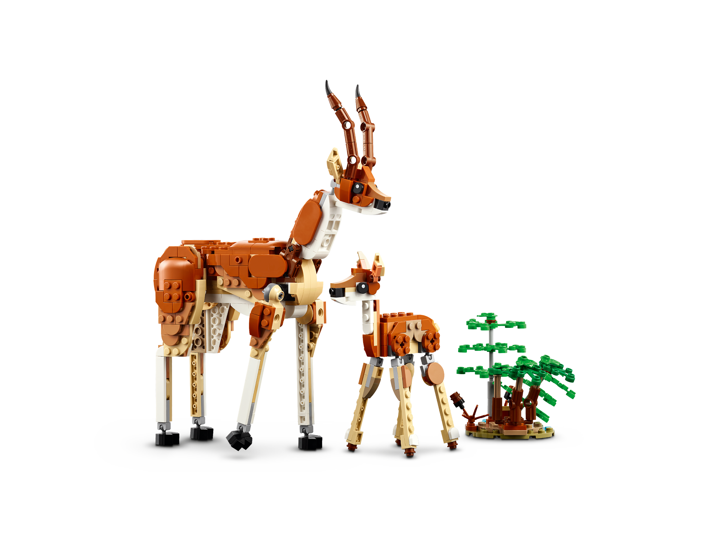 This LEGO set offers kids a world of play possibilities with 3 different animal toys to build using the same bricks. They can build a posable giraffe toy with a tree and a flamingo, rebuild it into 2 posable gazelle toys, a mother with her calf, plus 2 bushes, or turn it into a lion toy with a tree and a butterfly.