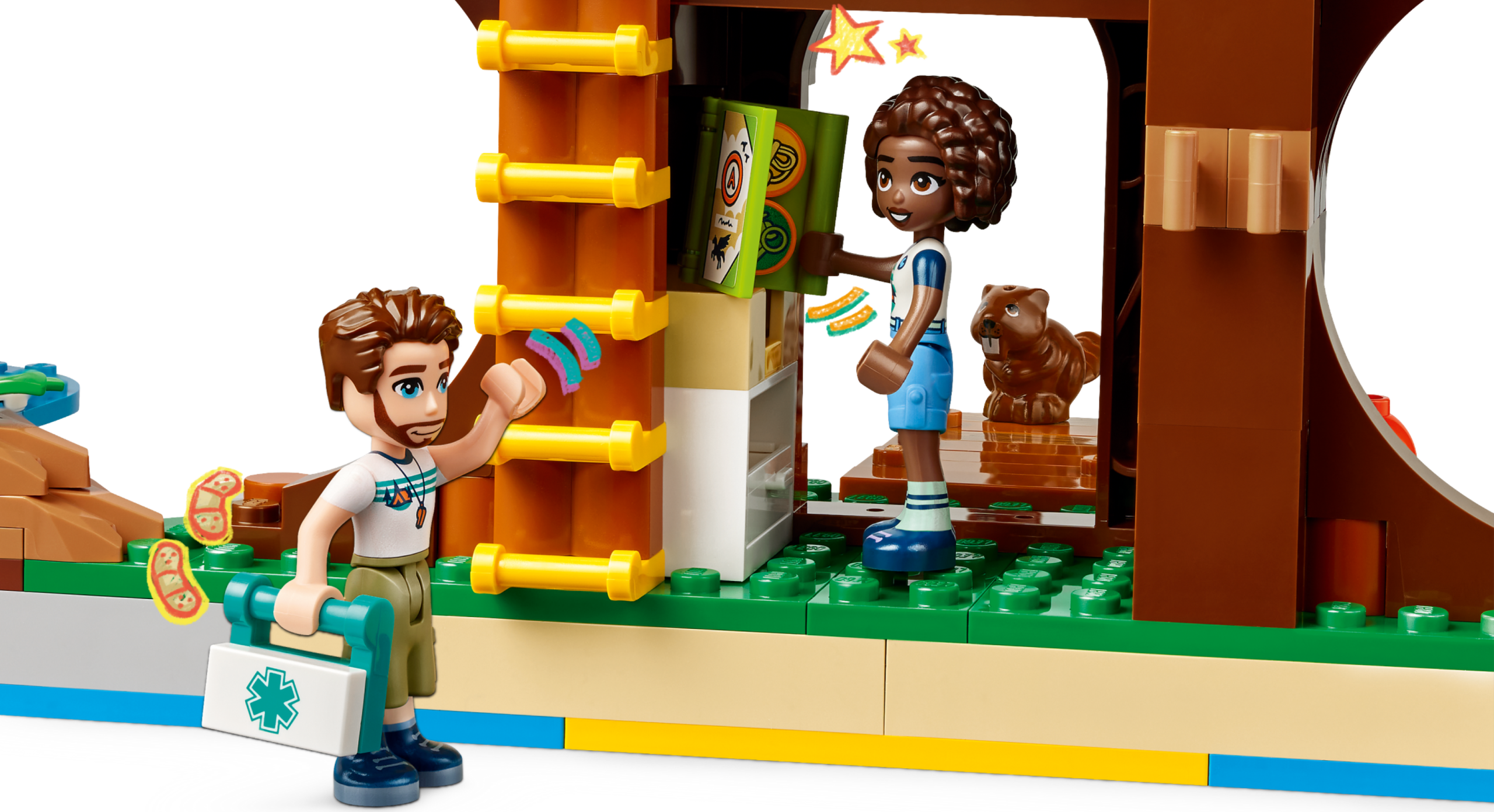 The building set is filled with fun features for creative play and comes with 5 mini-dolls, accessories and lots of animal figures, including 2 beavers who are building a dam. Send the characters whizzing down the zip line or help them navigate the obstacle course with its log bridge, climbing wall and trapdoors. There are also activities like canoeing, plus an island that can be reached by boat or zip line!