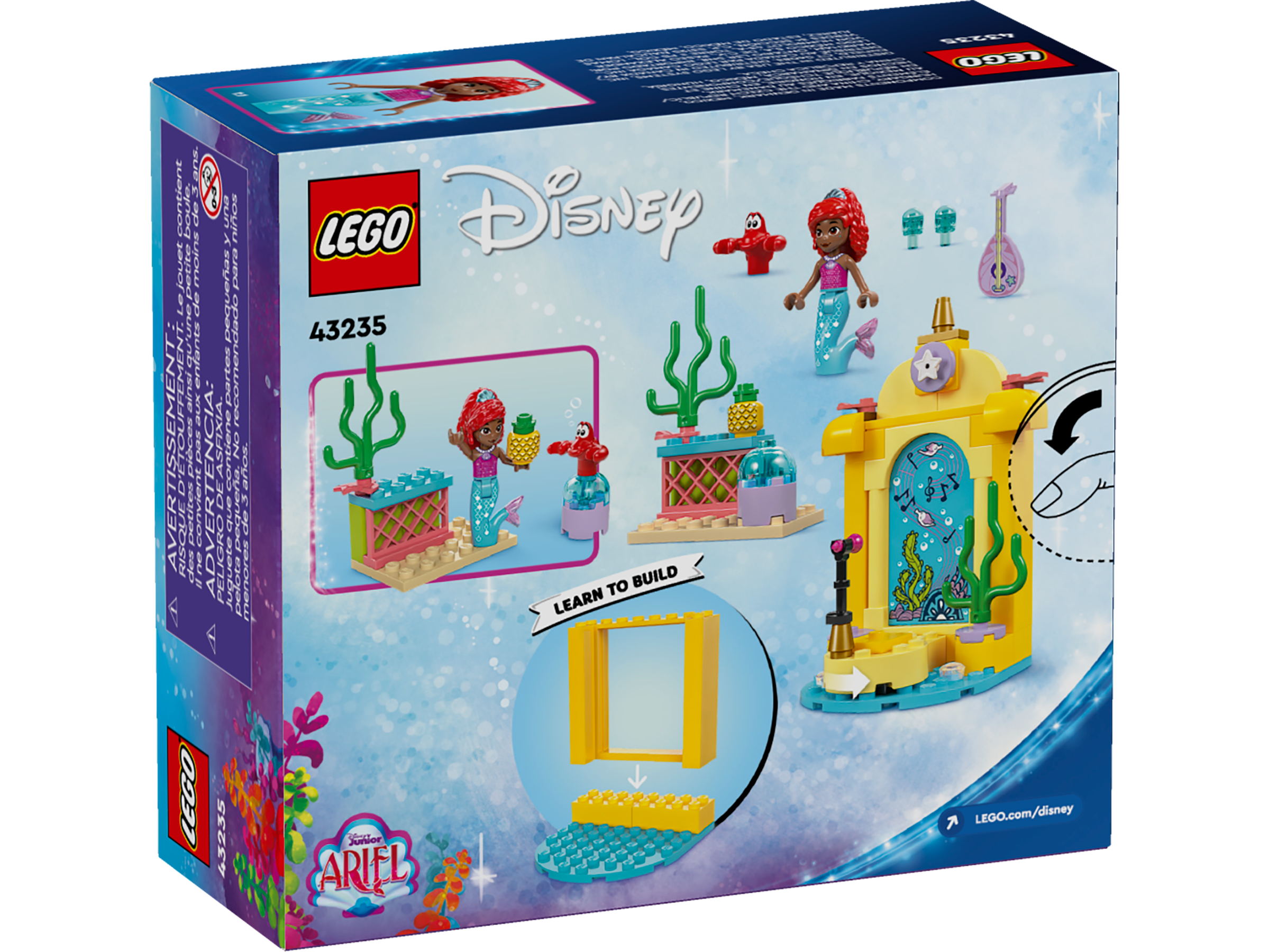 This kids’ building toy includes a LEGO ǀ Disney Ariel mini-doll figure and LEGO ǀ Disney Sebastian animal figure. There’s also a stage with a spinning floor, and a refreshment area build with a chair and fun story starter elements including a guitar, maracas and a pineapple. A Starter Brick element gives kids a sturdy base so play can start fast, while intuitive instructions are provided in the form of a colorful picture-story guide made for kidswho are just starting to learn how to read.