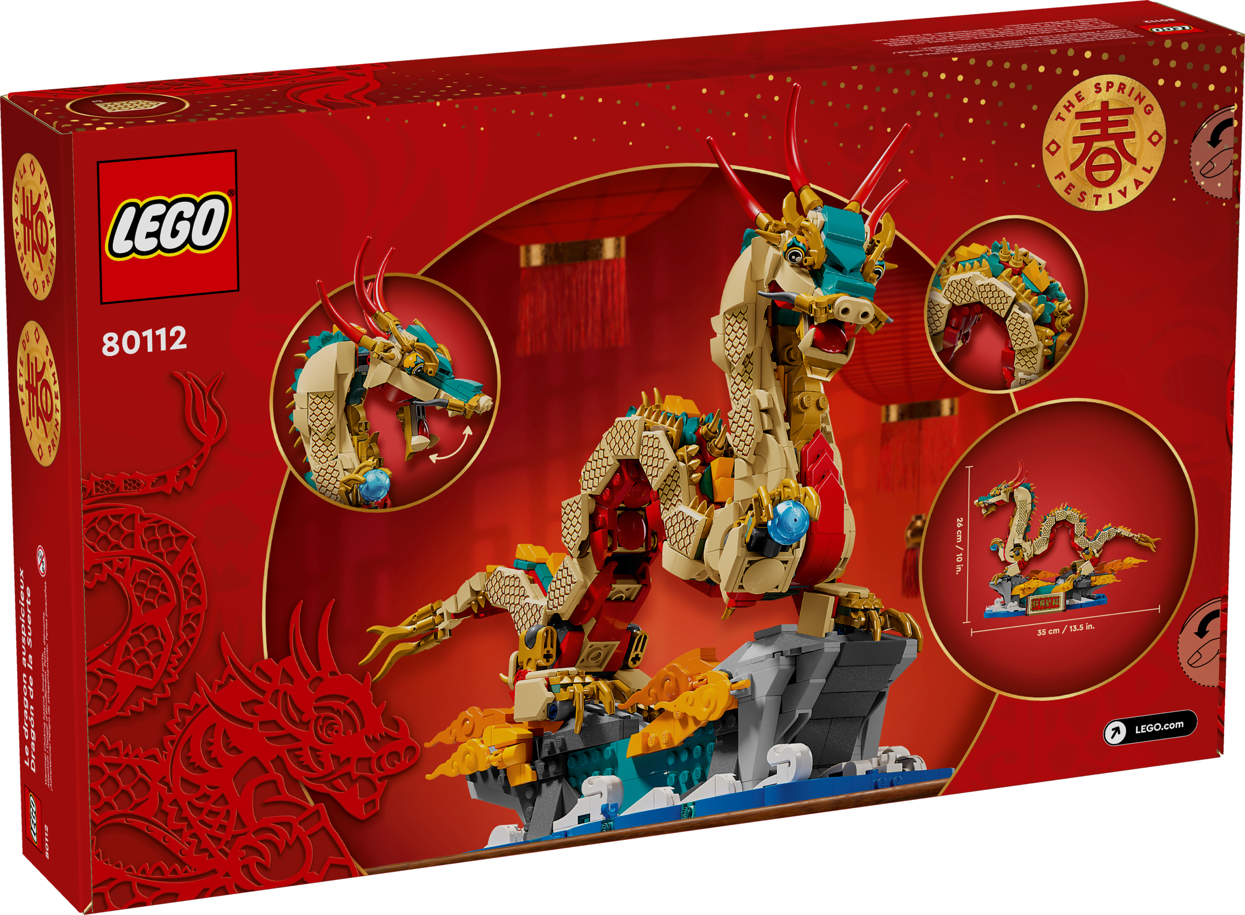Usher in the Year of the Dragon with this majestic LEGO® Spring Festival Auspicious Dragon figure (80112). A meaningful, symbolic cultural gift toy for yourself or kids aged 10 and over, this LEGO brick-built mythical creature features a tilting head and an opening mouth. Specially printed elements for the eyes and scales enhance its authentic look. The buildable toy dragon holds a traditional blue crystal element and is sitting on a brick-built rock in the sea. Attach the nameplate to complete a dramatic display.