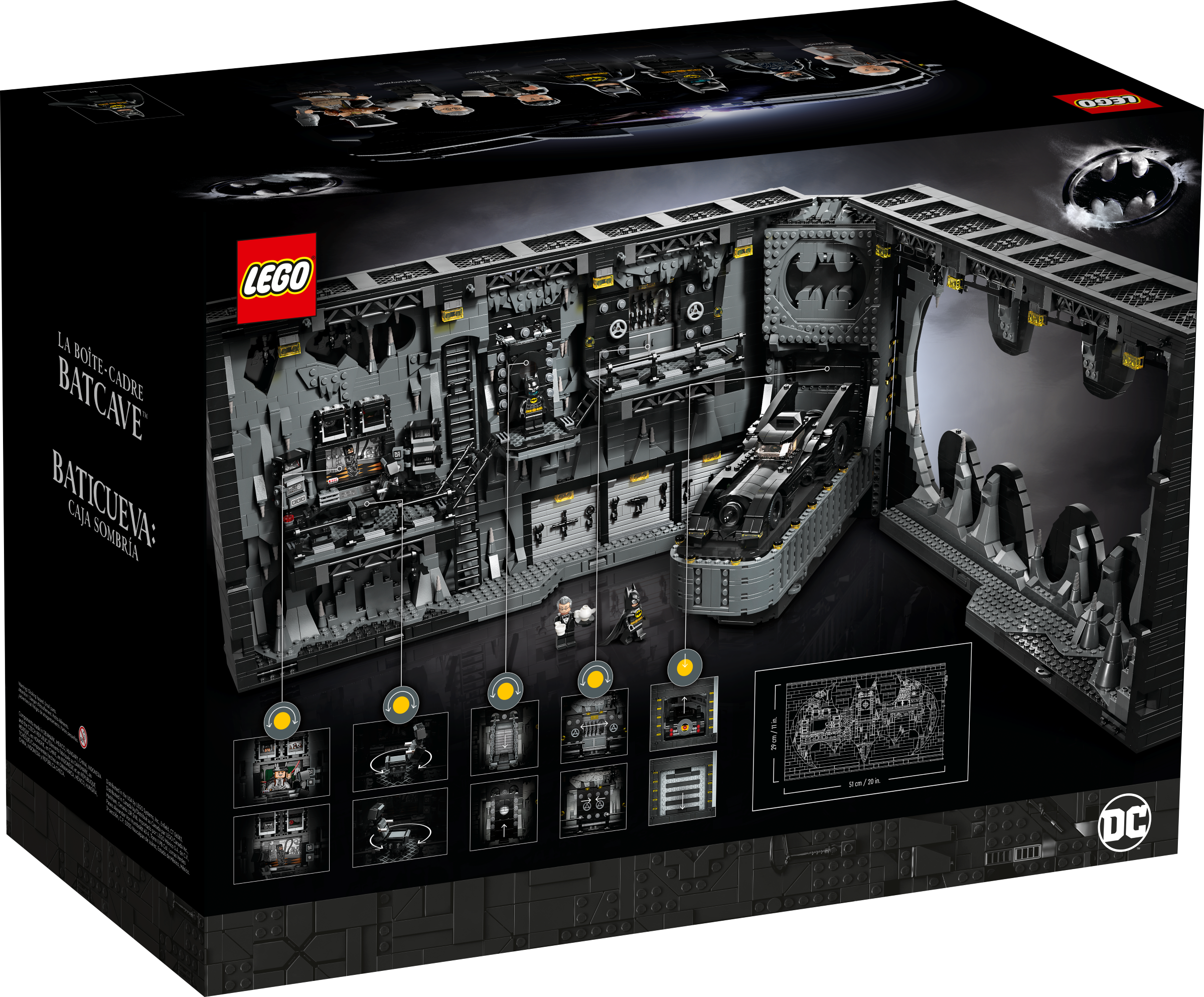 Measuring over 51 cm (20 in.) wide, this Batcave tableau contains an assortment of authentic details, including movable items that can be controlled from the rear. Users can turn the chair, change the computer screen and open and close the tool store and illuminated Batsuit™ vault. For extra realism, a Batmobile with a variety of hands-on features is included along with 7 minifigures: Max Shreck, The Penguin™, Catwoman™, 2 versions of Batman, Alfred Pennyworth™ and Bruce Wayne™.For added convenience, a digital version of the set’s building instructions can be found on the LEGO Builder app.