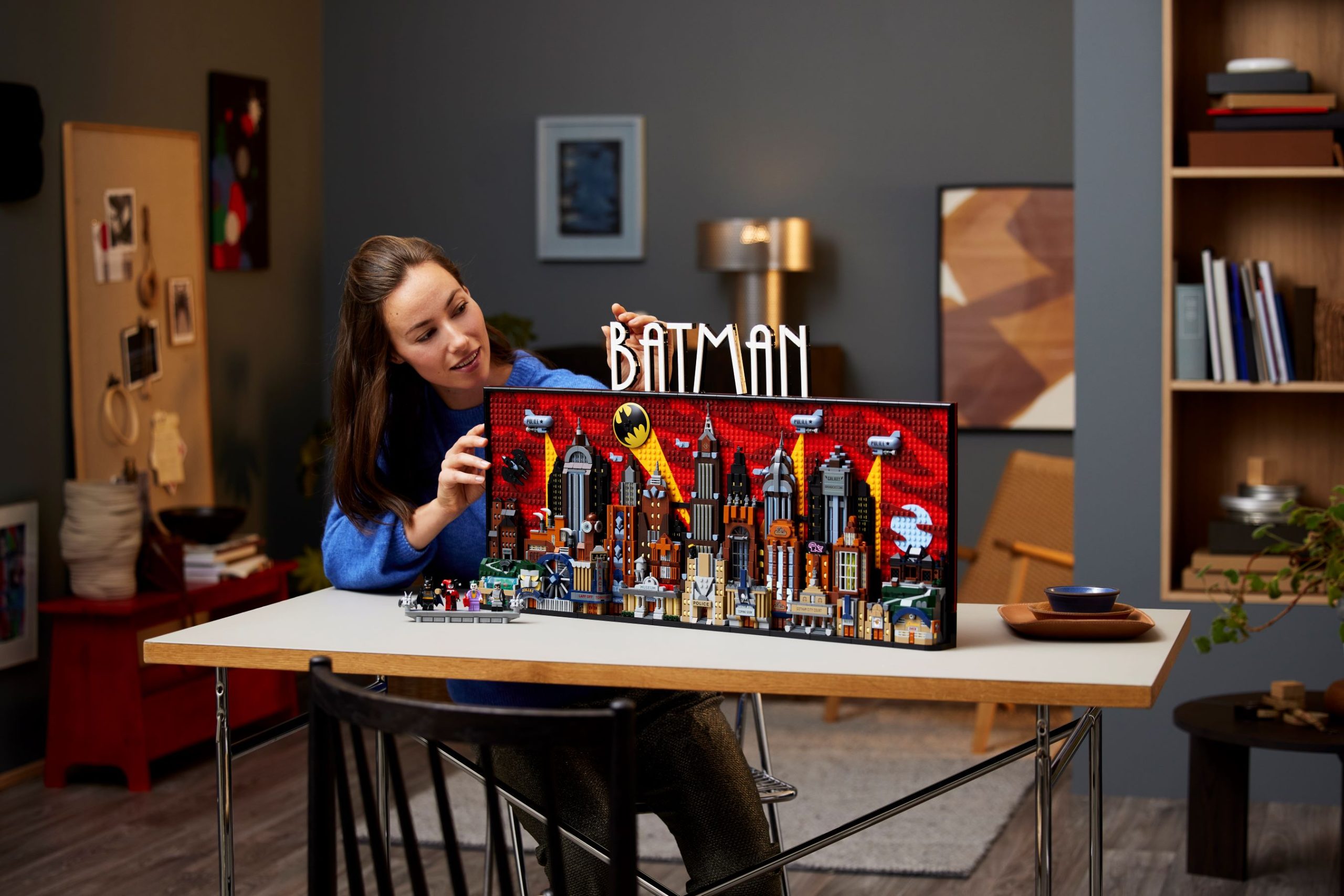 This 4,210-piece buildable GOTHAM CITY backdrop measures over 76 cm (30 in.) wide. It incorporates 15 panels that remove to reveal the inside of Wayne Manor, the Batcave™ and Arkham Asylum, and the activities of numerous villains from Batman: The Animated Series. The set also includes 4 minifigures – Batman, The Joker™, Harley Quinn™ and Catwoman™ – and a removable Batmobile™ and Batwing™. The assembled model can be mounted on a wall or stood on a surface using a flip-out stand. The 2 sets of included building instructions allow 2 people to work on the model simultaneously. For added convenience, a digital version of the set’s building instructions can be found on the LEGO Builder app.