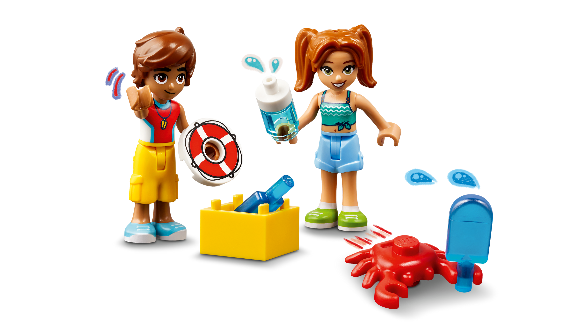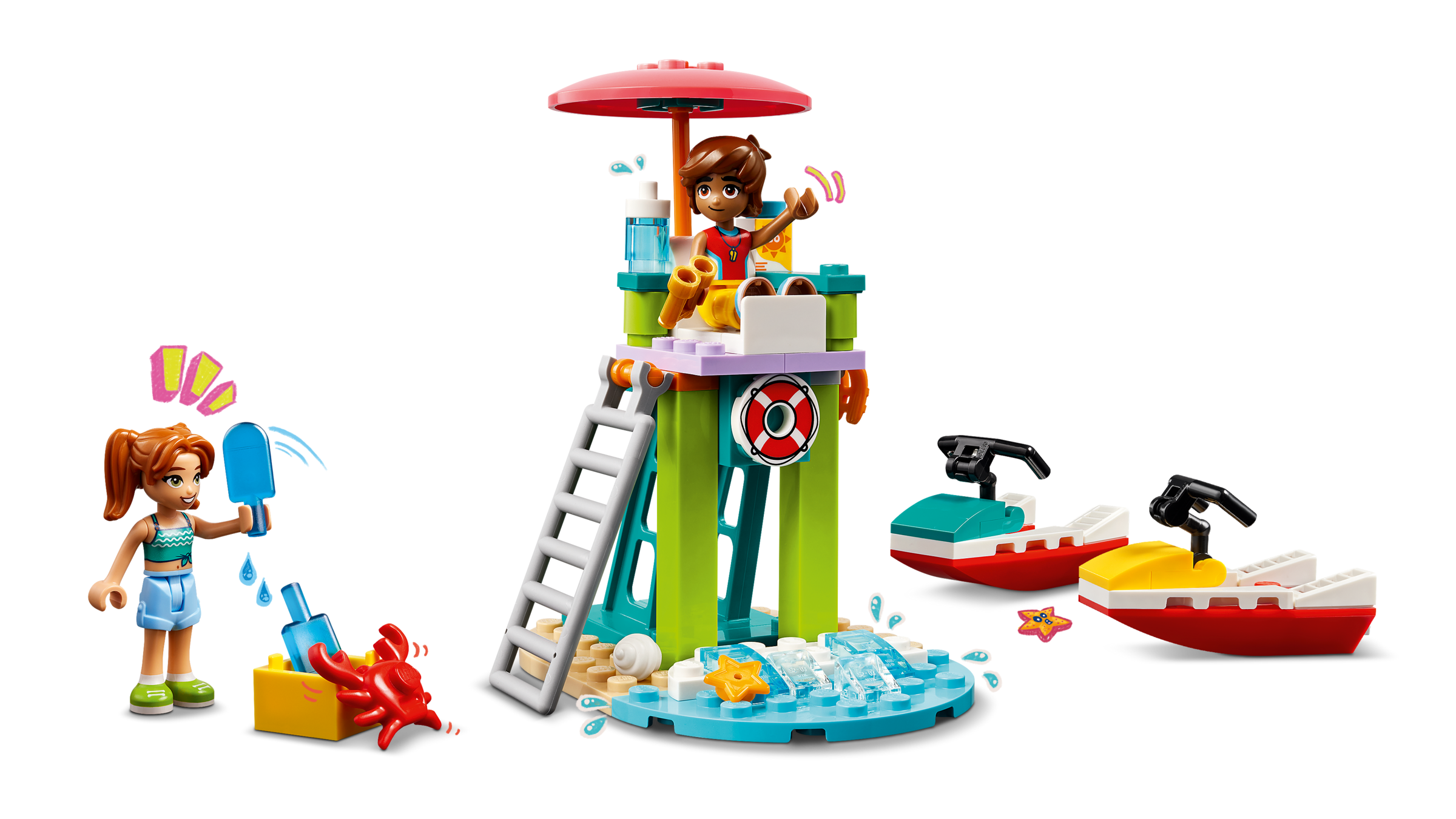 This lifeguard LEGO set comes with 2 water scooter toy accessories so kids can role-play the story. Leo is on lifeguard duty and uses the binoculars to keep watch over the ocean. It’s the perfect viewpoint for spotting dolphins too. Later he joins his friend Candi and the friends race on their water scooters. Kids will love the little details, like the cheeky crab who likes to raid the cooler for ice pops!