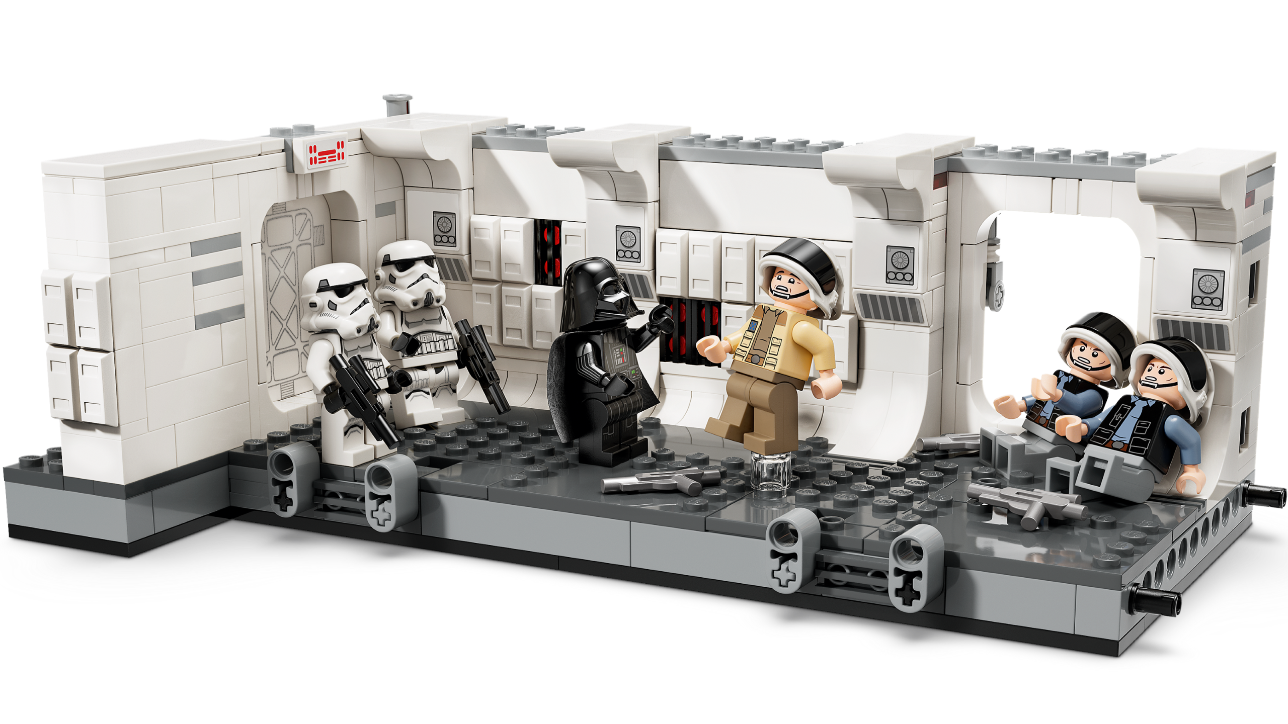 Relive Darth Vader and his Stormtroopers boarding the Tantive IV in Star Wars: A New Hope with this buildable toy playset (75387) for kids aged 8 and over. It features a detailed recreation of the corridor inside Tantive IV where Darth Vader’s Stormtroopers battled Captain Antilles’ Rebel Fleet Troopers, with levers to ‘blast’ open the entrance door and topple characters during battle play. Connectors allow builders to add another 75387 set (sold separately) to extend the corridor.
