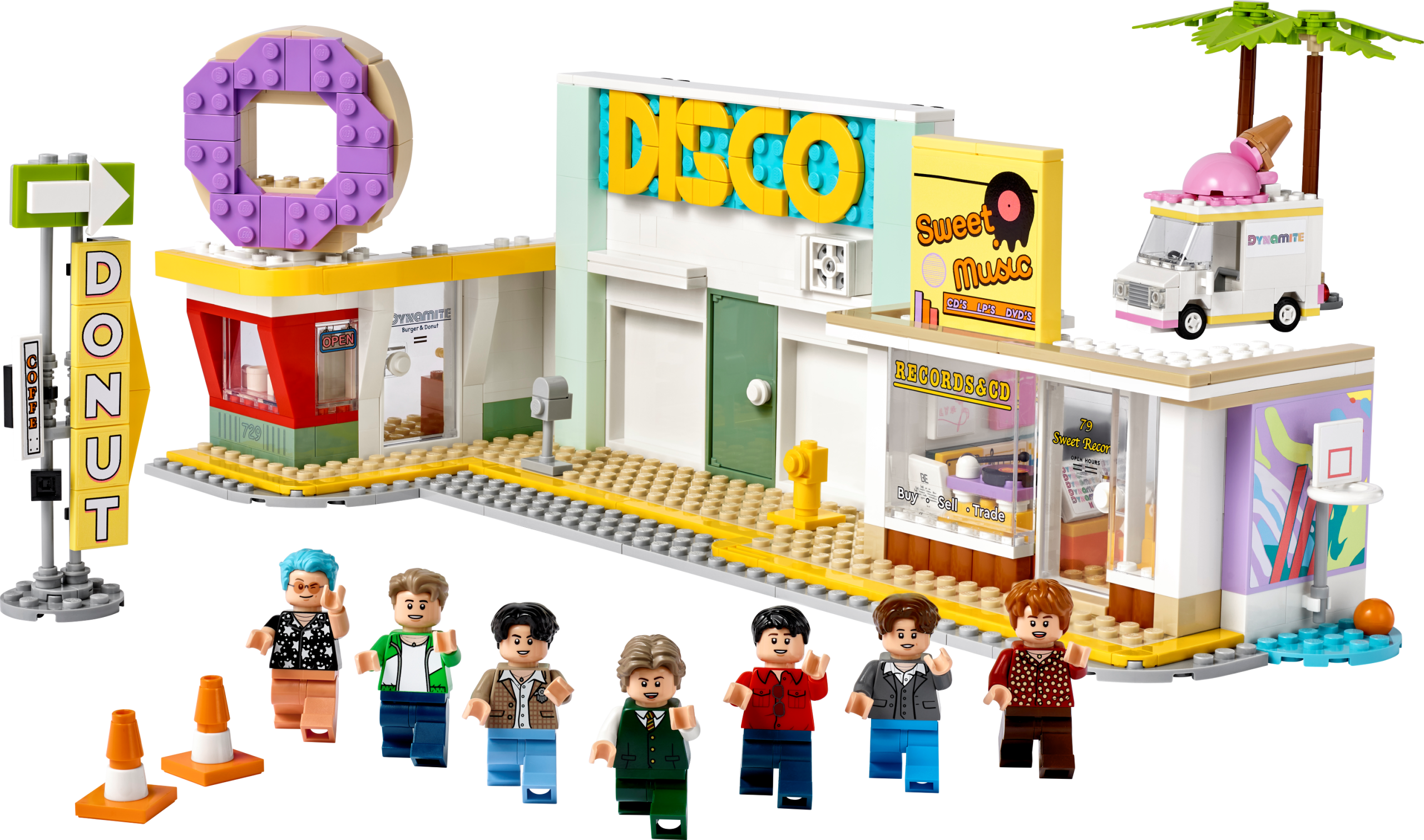 Capture the joyful energy of 21st-century pop icons RM, Jin, SUGA, j-hope, Jimin, V and Jung Kook with the LEGO® Ideas BTS Dynamite (21339) music video set. Find your building groove to recreate colourful scenes from the video for their multi-platinum single Dynamite, with LEGO brick versions of the disco, record shop, doughnut shop, ice-cream van and more. Add LEGO minifigures of the group members to the different locations or place them all on the special stage and turn the wheel to see them dance.