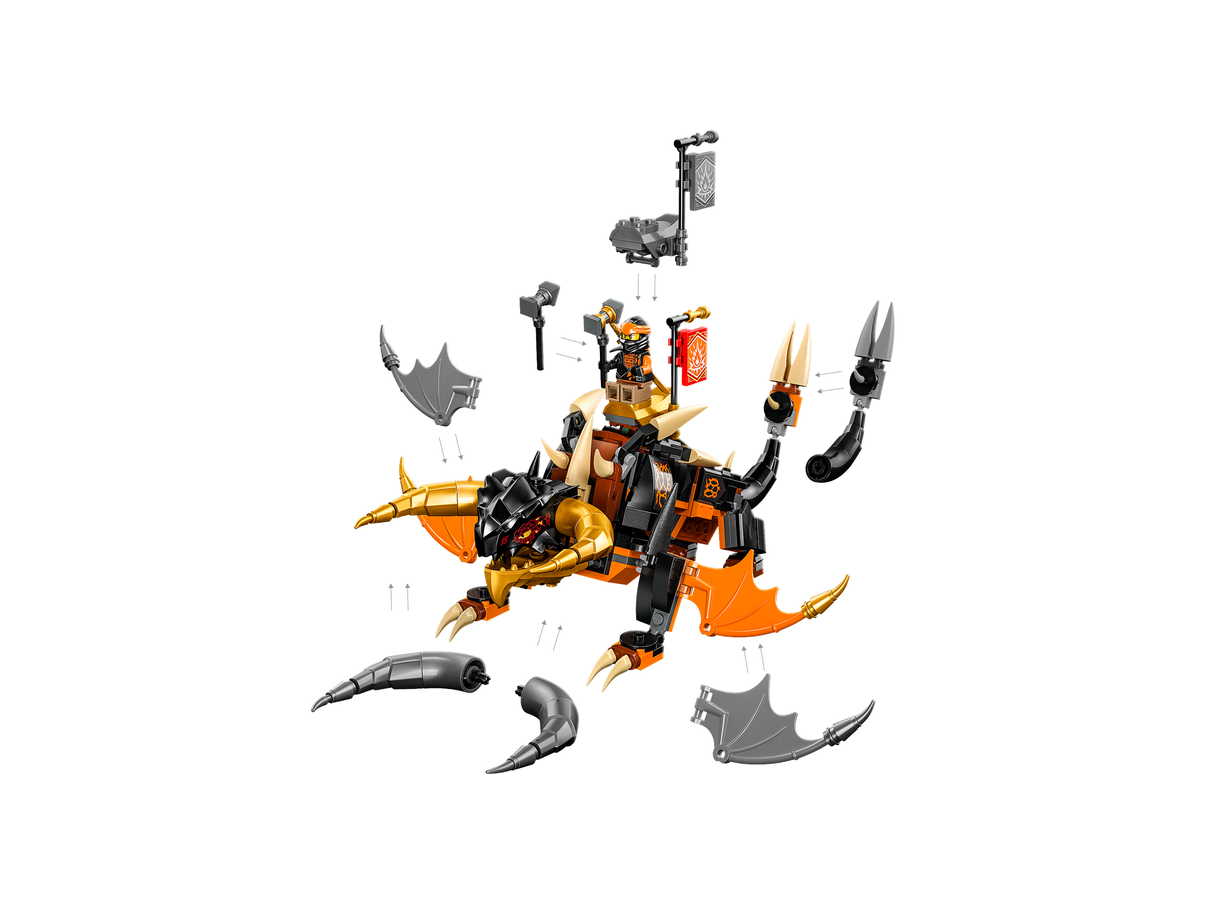 The playset includes 2 minifigures: Cole armed with a golden katana, and Bone Scorpio with a scythe and a bone warrior assorted weapons pack. Bone Scorpio can also can ride into battle on his 6-legged scorpion creature. For succeeding in their challenge, kids are rewarded with a collectible Strength banner.