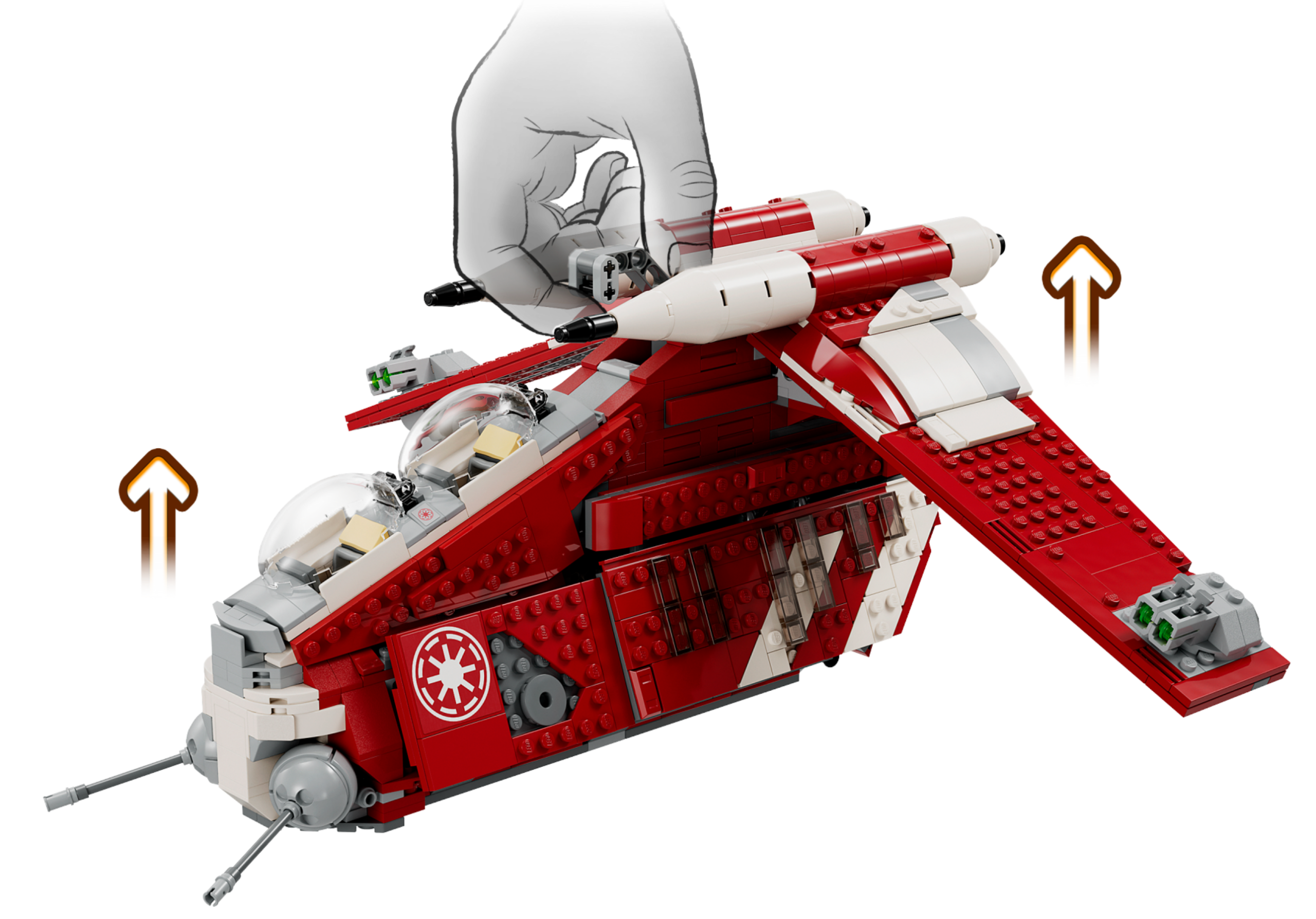 Fans can take command of their own Star Wars: The Clone Wars missions with this LEGO® brick Coruscant Guard Gunship (75354). It features 2 pilot cockpits, 2 stud shooters, 2 adjustable cannons and a handle for flying. The rear hatch and sliding side panel give easy access to the cabin where there is space for troopers. A top Star Wars™ gift idea for kids aged 9 and up, the set also includes 5 LEGO minifigures, including Commander Fox, Chancellor Palpatine and Padmé Amidala, plus 3 blaster pistols and 2 blasters for action play.