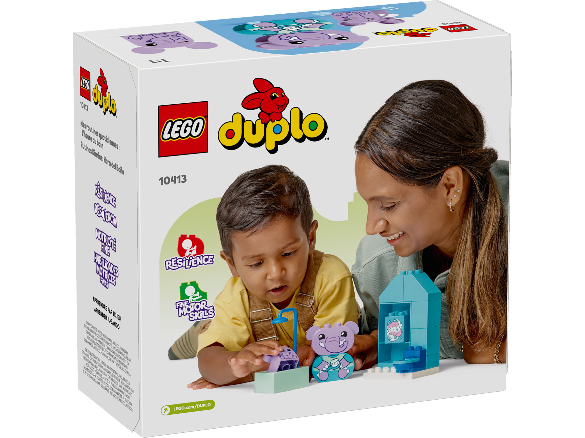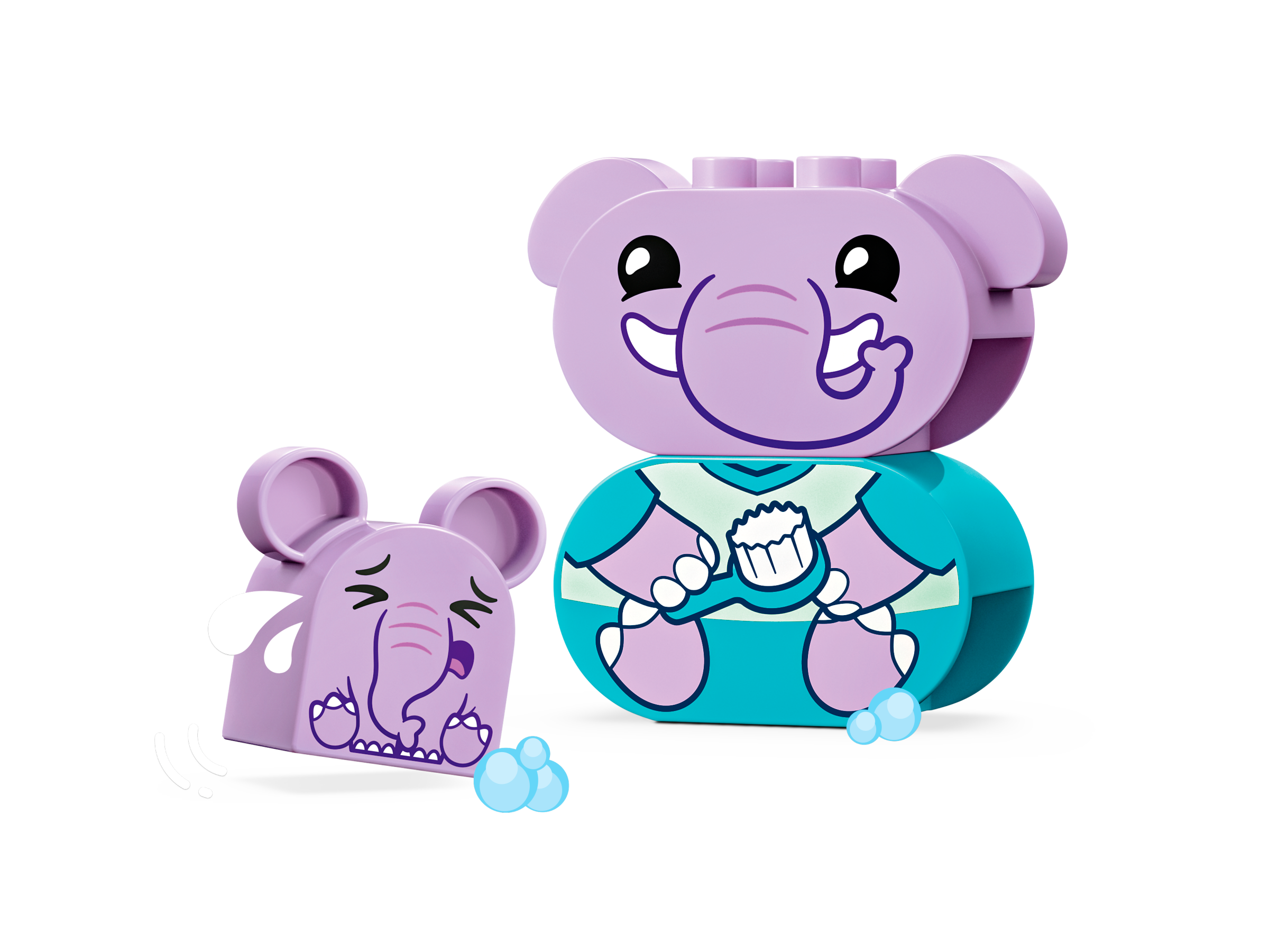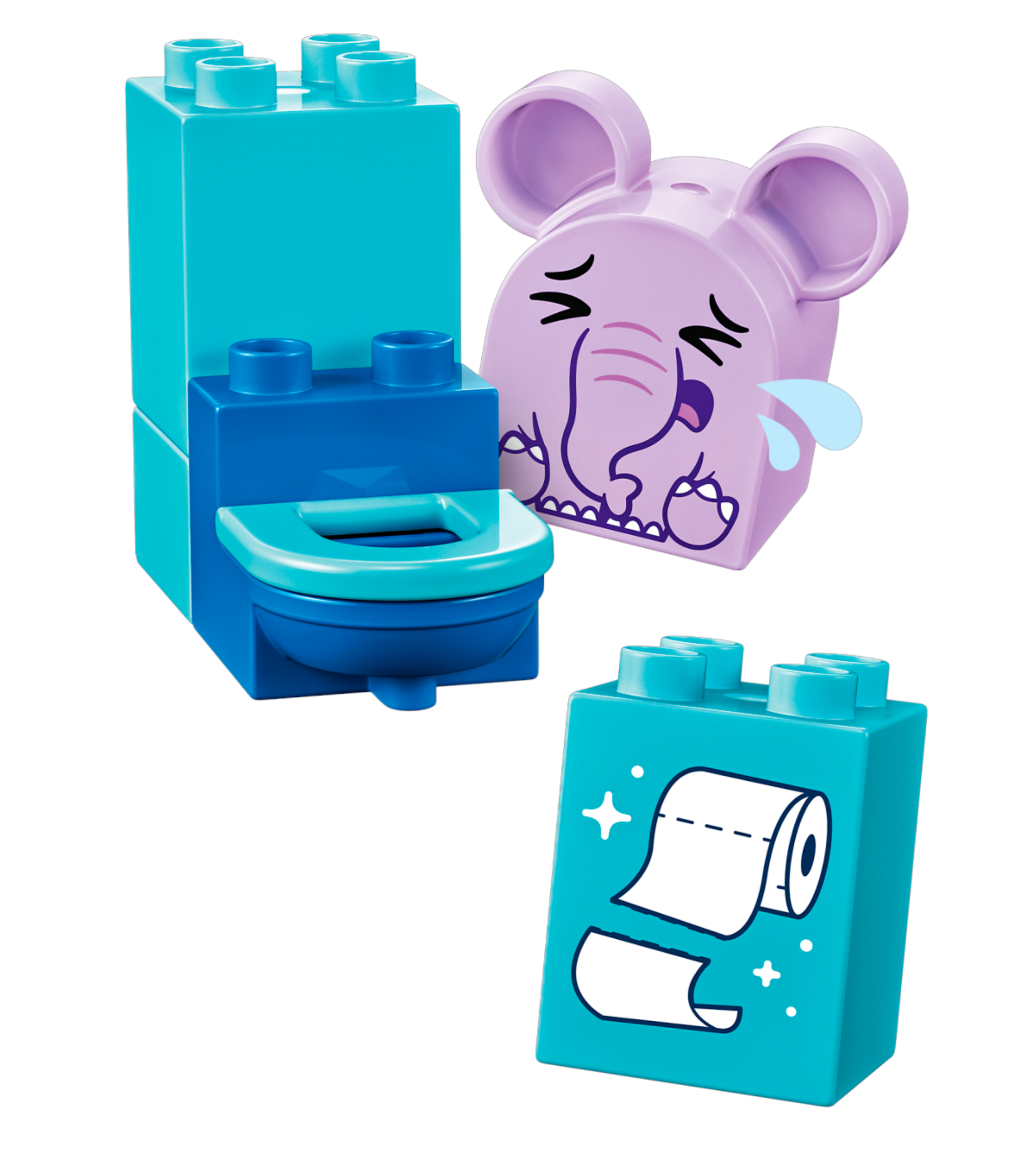 Help preschoolers aged 18 months and up understand their feelings around washing with the My First Daily Routines: Bath Time (10413) learning toy for toddlers. This animal playset comes with 2 elephant toys – a parent and a baby – and a bath, shower and toilet. Parents and preschool kids join their new LEGO® DUPLO® animal friends in the bathroom, enjoying the fun role-play of getting the baby clean while exploring the importance of washing routines.