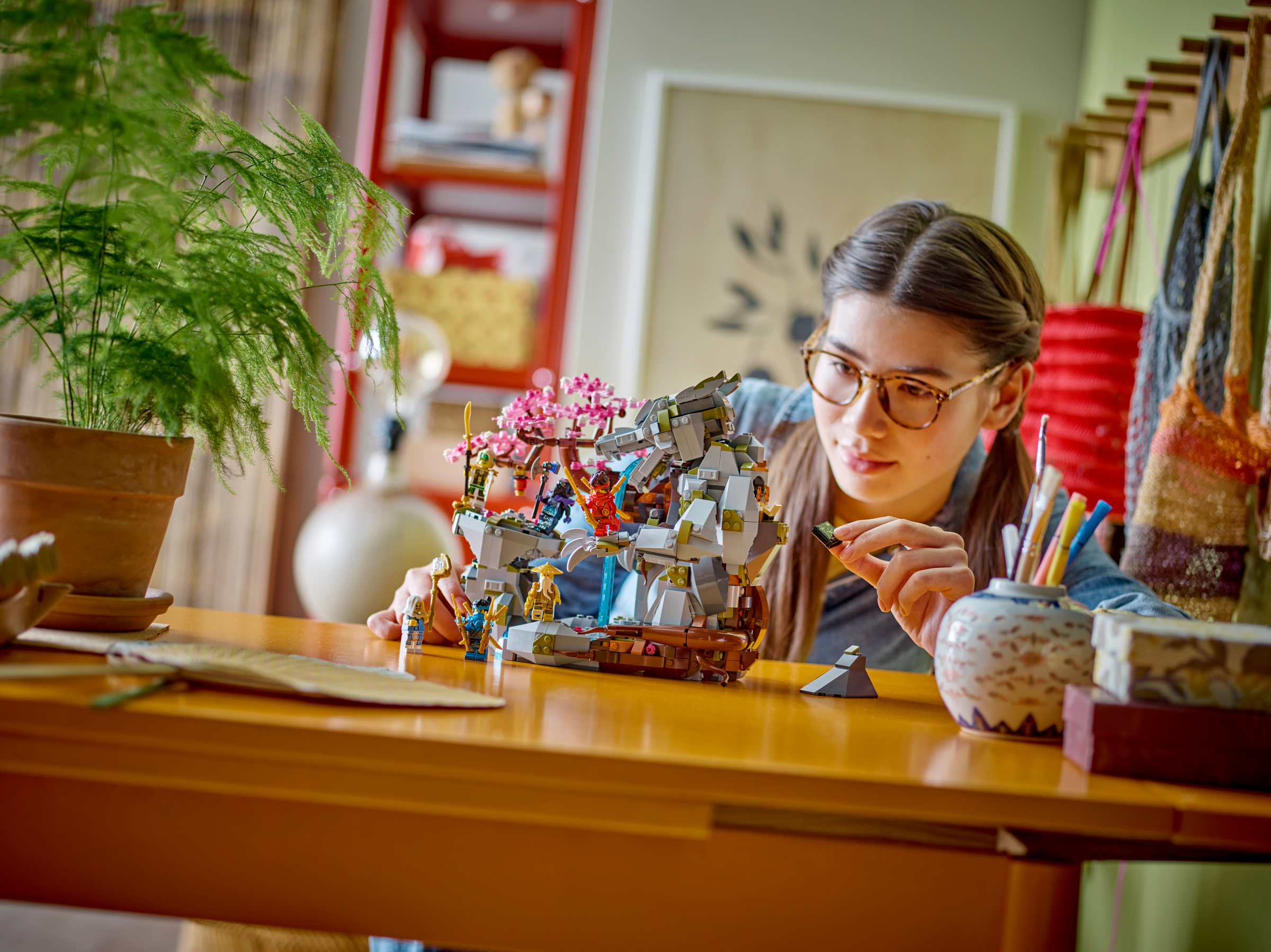 This buildable model comes with 6 NINJAGO character minifigures: Master Lloyd with a staff accessory, Master Wu with a spear accessory, Nya with 2 katana sword accessories and a pair of ninja sai, Kai with 2 katana sword accessories and a sword accessory, Euphrasia with a staff accessory and Lord Ras with his hammer. Kids have all they need to play out exciting ninja battles.