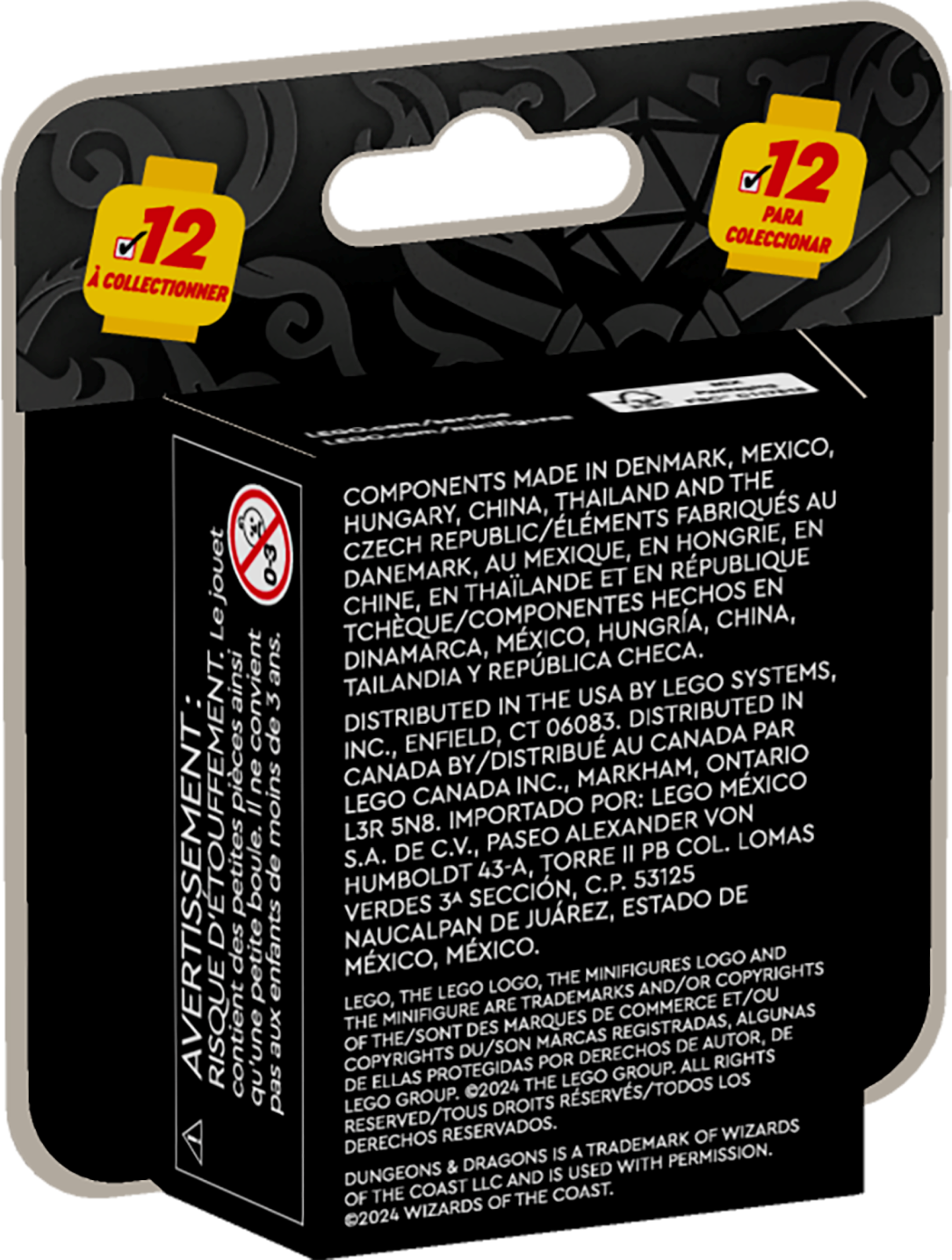 There is 1 surprise LEGO Dungeons & Dragons minifigure in each box and a total of 12 characters to collect: Tiefling Sorcerer, Elf Bard, Halfling Druid, Dwarf Barbarian, Dragonborn Paladin, Aarakocra Ranger, Gith Warlock, Mind Flayer, The Lady of Pain, Strahd von Zarovich, Tasha the Witch Queen and Szass Tam.