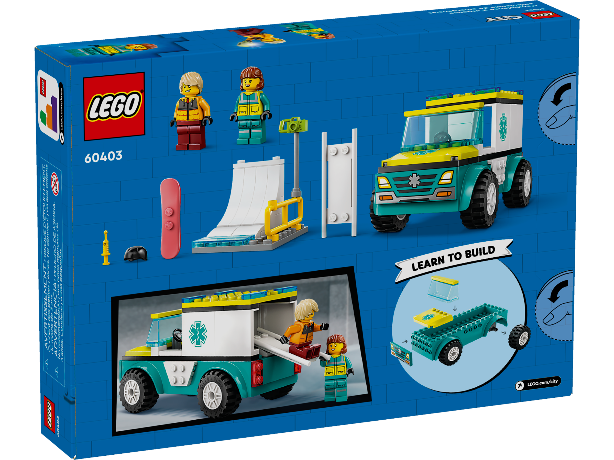 Join your little builder for quality playtime with the LEGO® City Emergency Ambulance and Snowboarder (60403) playset, featuring a toy ambulance with chunky tires for off-road rescues. This fun set also includes a mini scene depicting a snow-covered skate park, plus snowboarder and paramedic minifigures for imaginative storytelling.