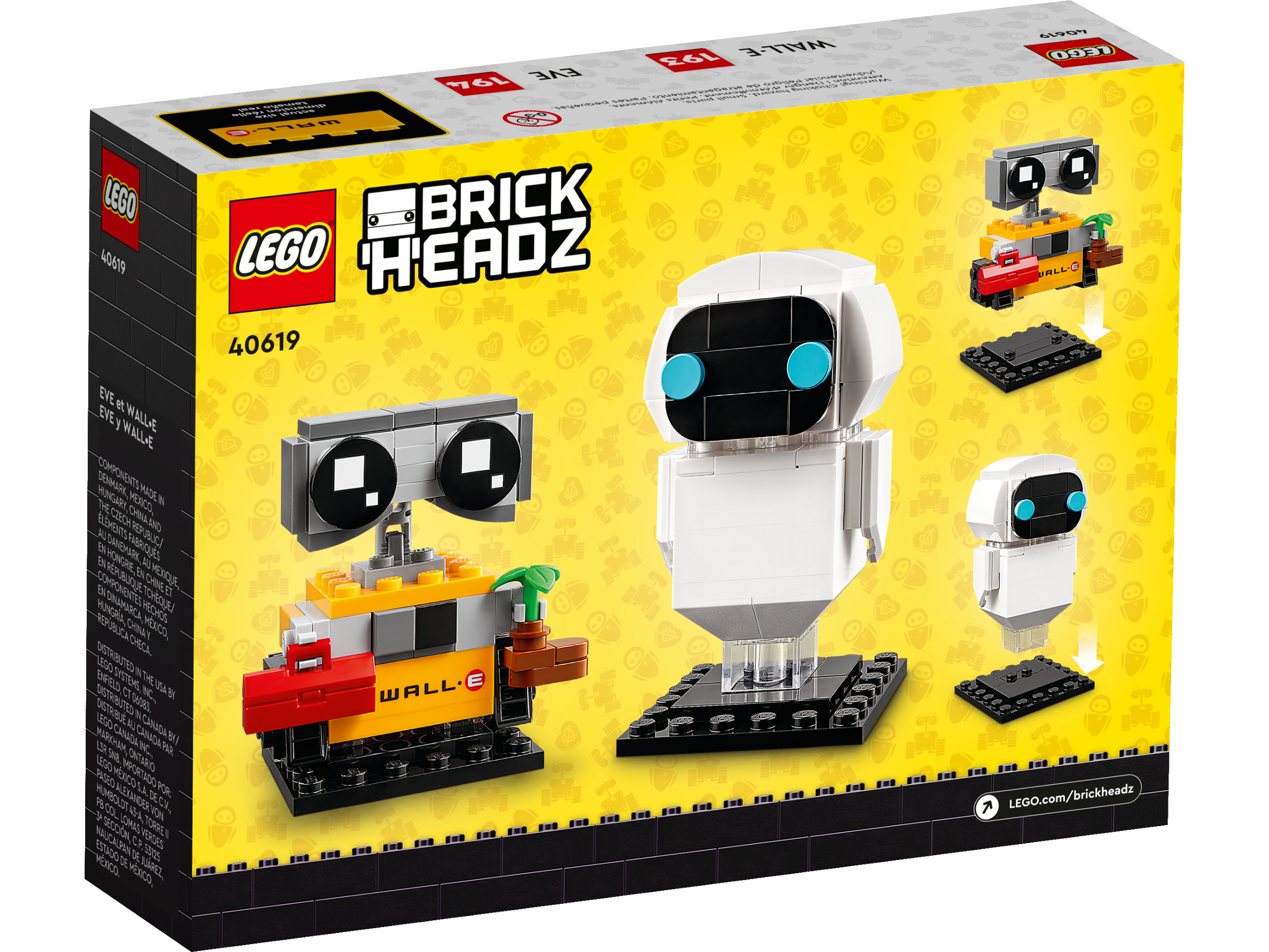 Captivate movie fans and kids aged 10 with this iconic BrickHeadz™ set featuring Disney•Pixar’s EVE & WALL•E (40619) buildable LEGO® figures. Build each of the detailed models, then set them on their individual baseplates for display anywhere. The collectible set consists of 155 pieces to create the robots, plus a small plant element. WALL•E’s torso and eyes are decorated stickers. The set makes a fun holiday or birthday gift and display piece for kids or fans of Disney•Pixar’s WALL•E movie.