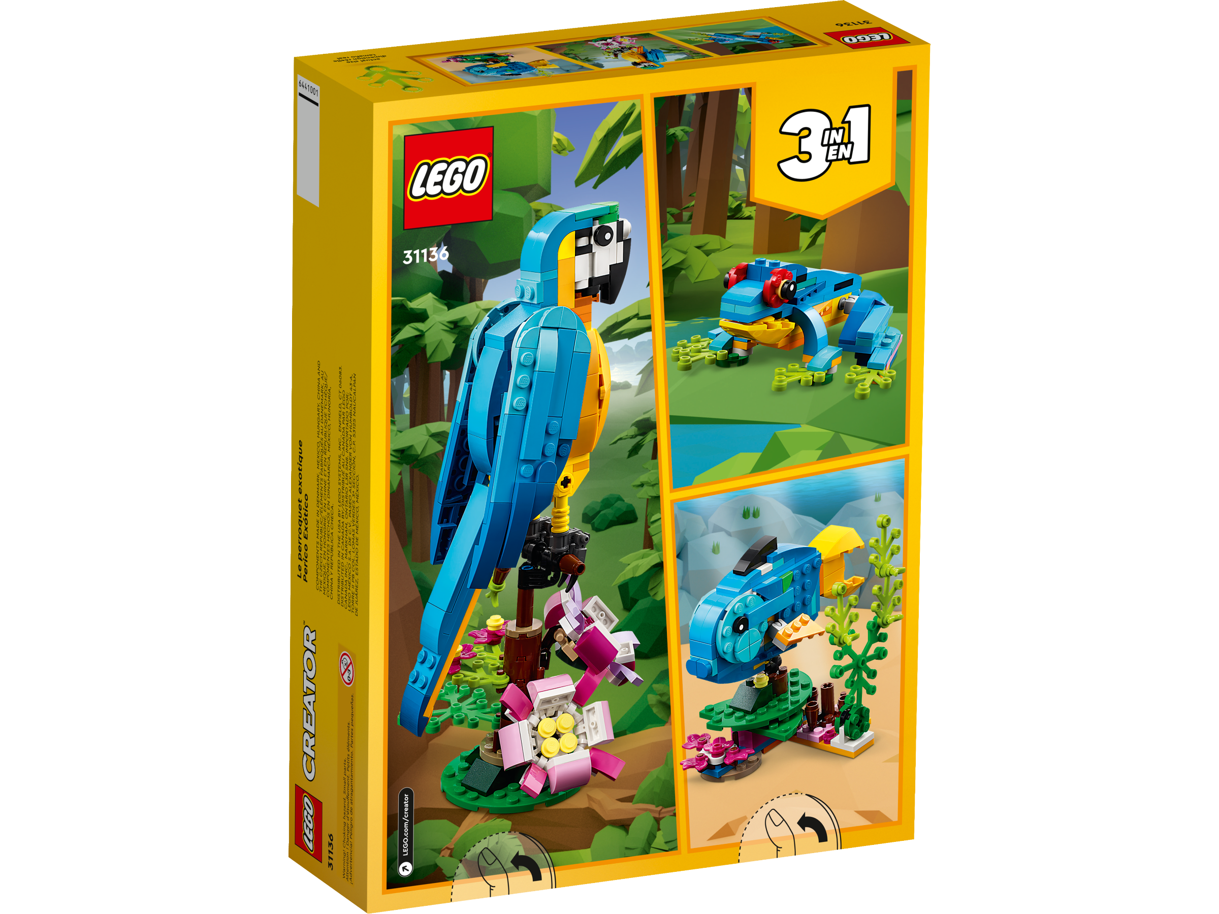 Little builders and passionate animal fans aged 7 can travel deep into the rainforest for action-packed stories with this LEGO® Creator 3in1 Exotic Parrot (31136) building set. It features a colorful parrot that can fully rotate its body while sitting on a tree branch and move its wings and tail.
