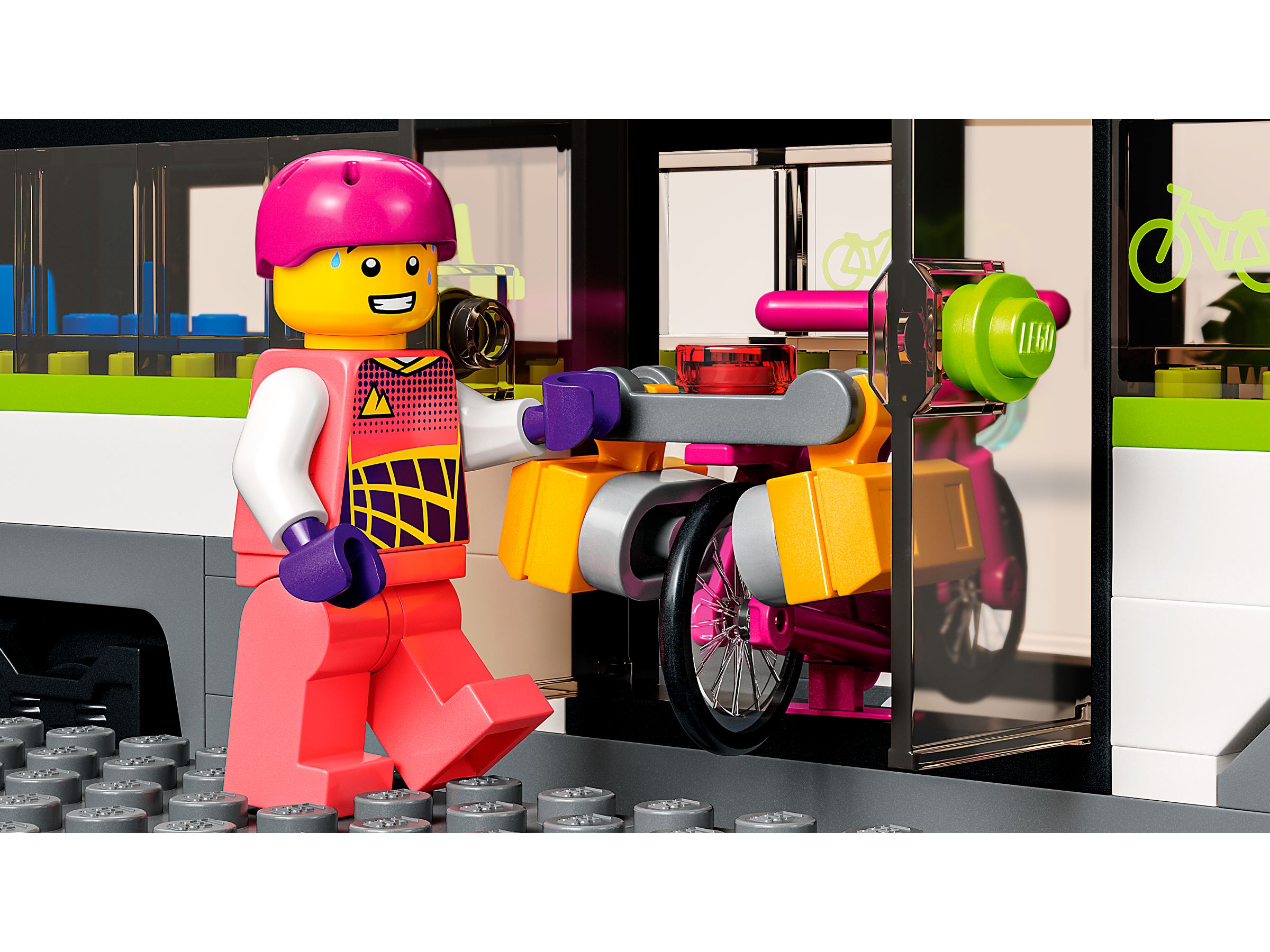 The LEGO® City Express Passenger Train set (60337) includes a remote-controlled bullet locomotive with working, dimmable headlights and LEGO Powered Up technology, a dining car, passenger car, station platform, 24 track pieces and 6 minifigures for endless hours of train-themed role play.