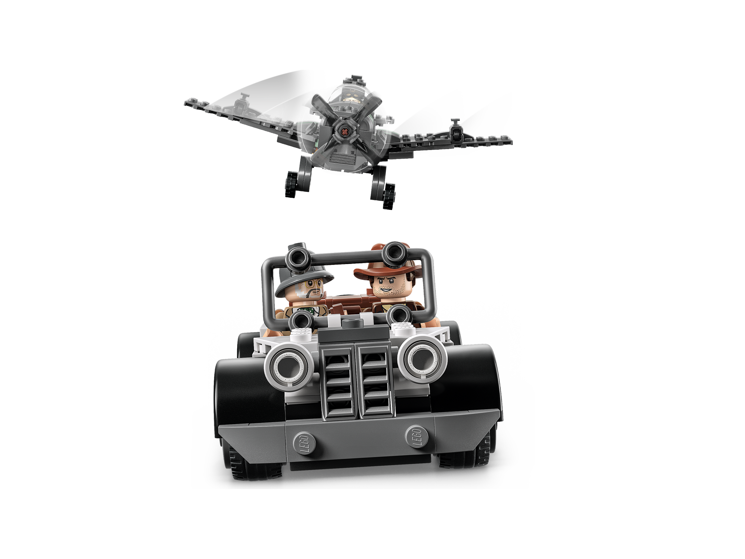 LEGO® Indiana Jones™ Fighter Plane Chase (77012) comes with everything kids aged 8 need to enjoy hours of creative play. The playset features a brilliant fighter plane with a propeller, 2 stud shooters and removable wings, plus a supercool vintage convertible car with a chest in the back containing an umbrella and a pistol.