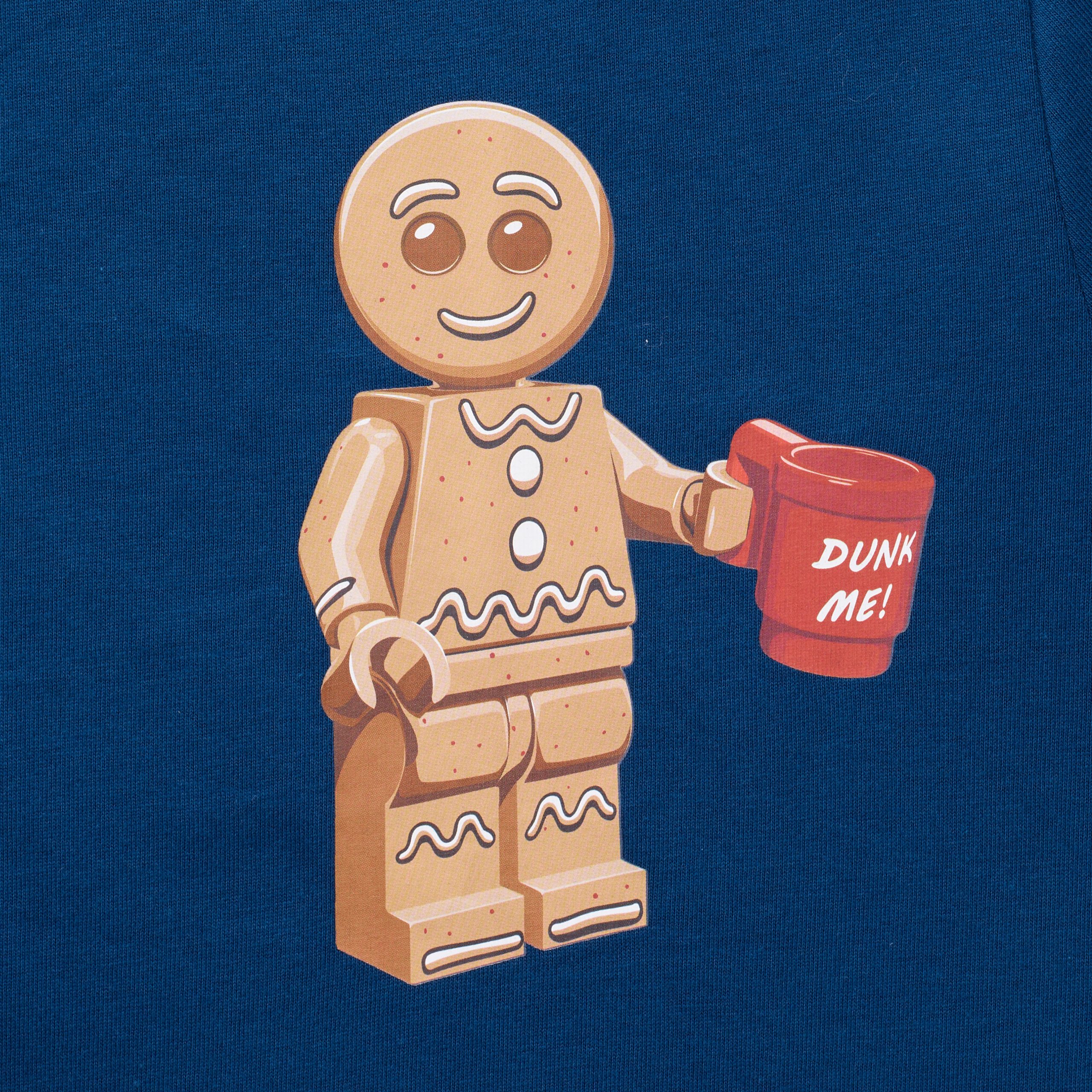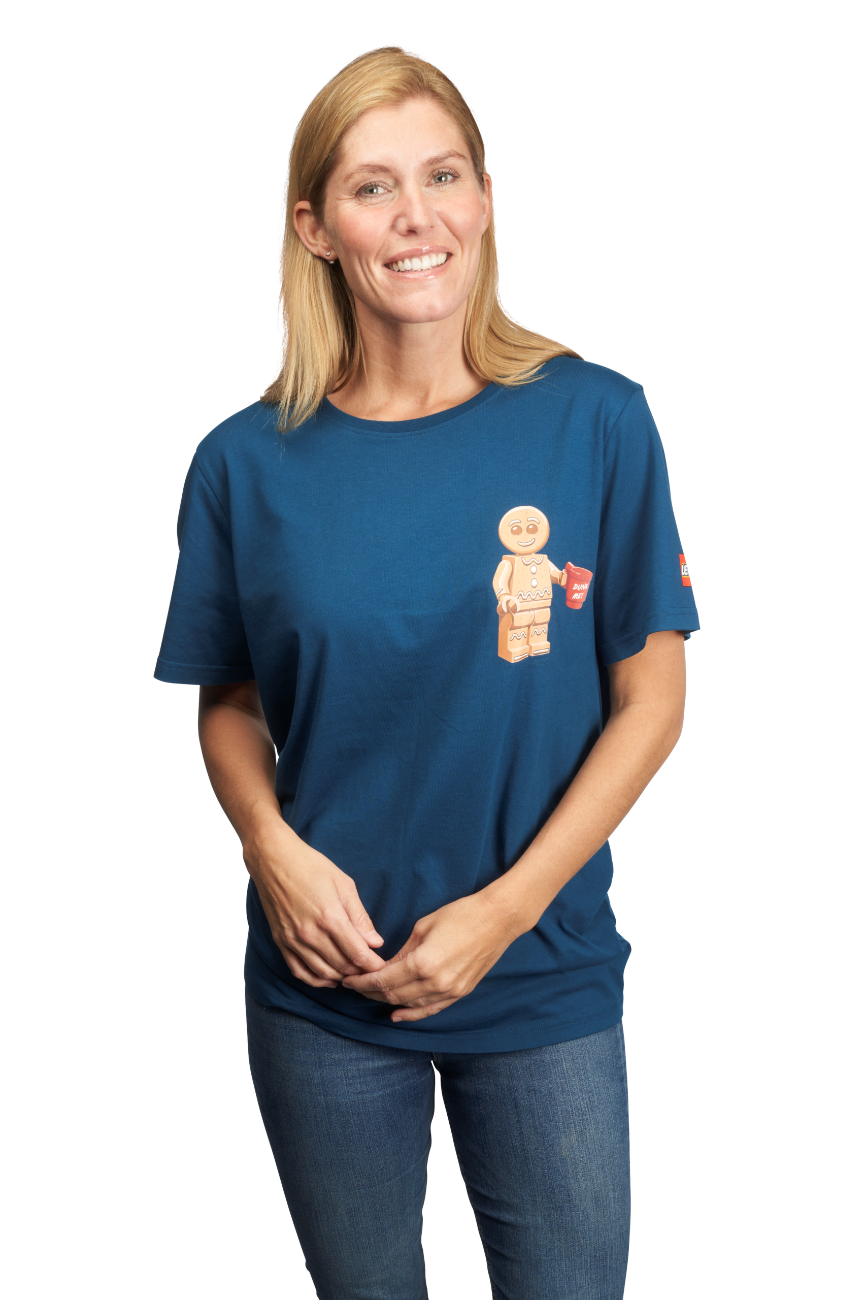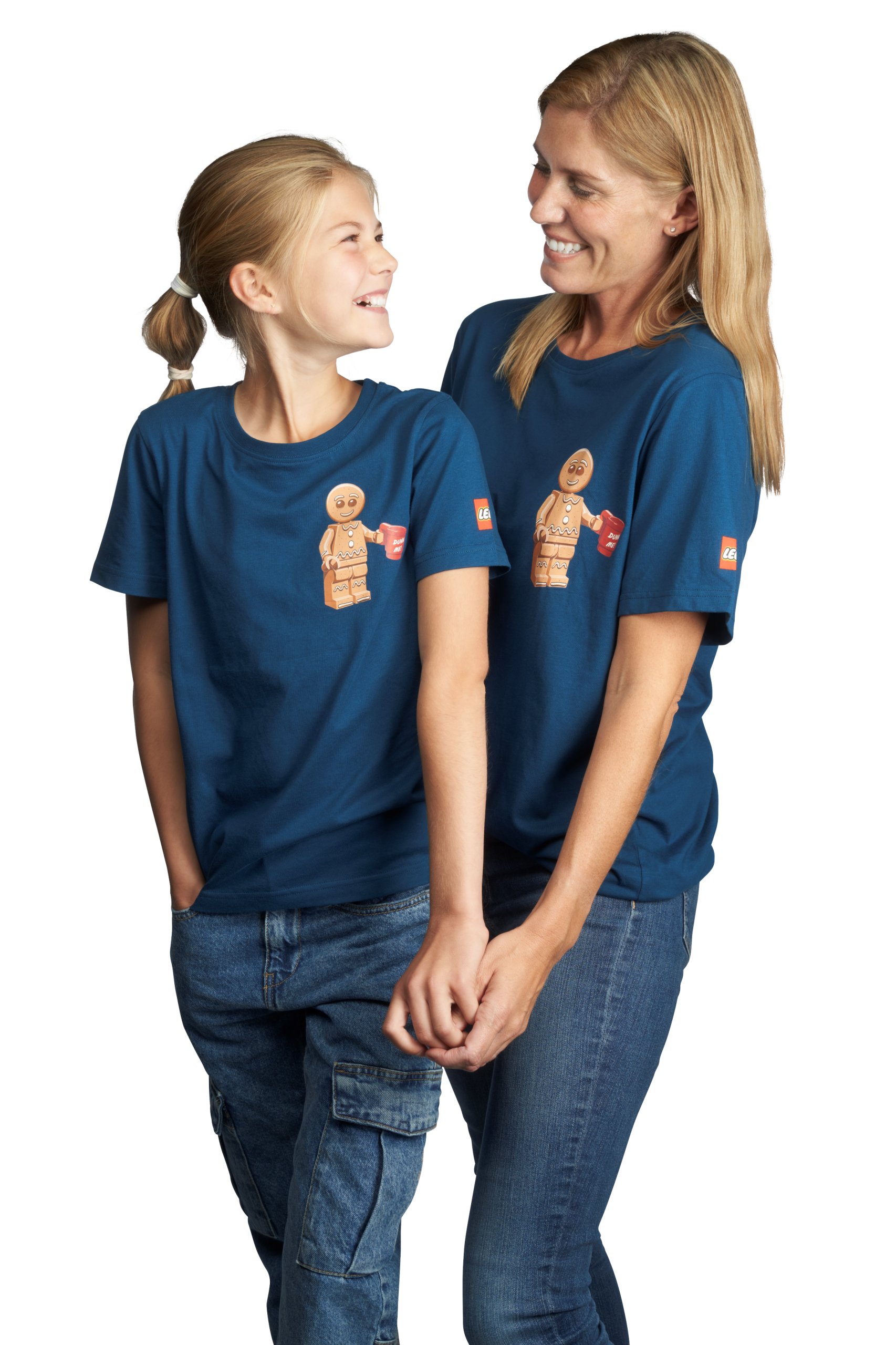 Show off your taste in LEGO® fashion with this Christmas T-shirt for adults, featuring an illustration of the iconic Gingerbread Man LEGO minifigure. A fun treat for yourself or gift idea for a friend who loves LEGO building sets, this stylish, blue, unisex, crew-neck T-shirt is made from 100% cotton for ultimate comfort and is available in various sizes so you can find your perfect fit. The model is 174 cm tall and wears a large (L) size T-shirt.